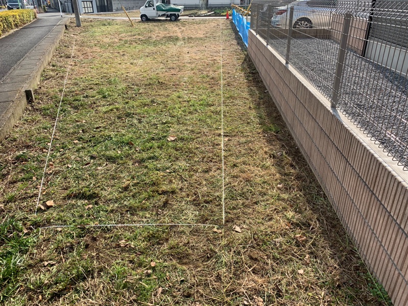 地縄とは、建物が建つ配置を何もない土地の上にロープ等で線を描いていきます。