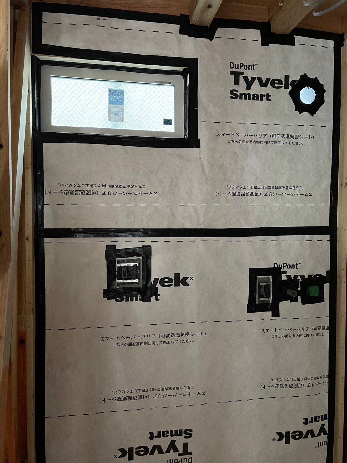 なかなか家の壁の中のことってイメージしにくいですが、壁の中は柱や断熱材が入っていて、さらにシート、板…となっているんです。このシートが気密を高めるのに大事で、弊社がおすすめしている「スマートタイベック」は、シートとテープによって、空気の出入りをしっかり遮断してくれるのです。これが「空気が通らない層」なんですね‼