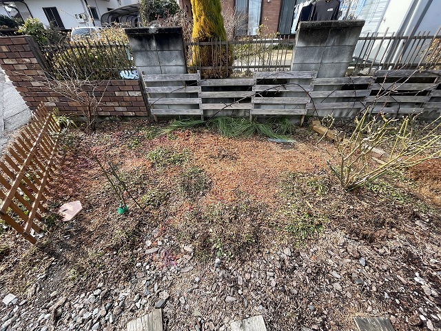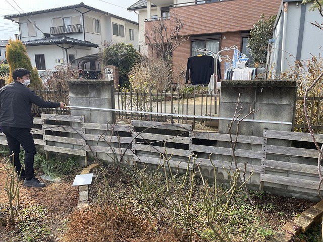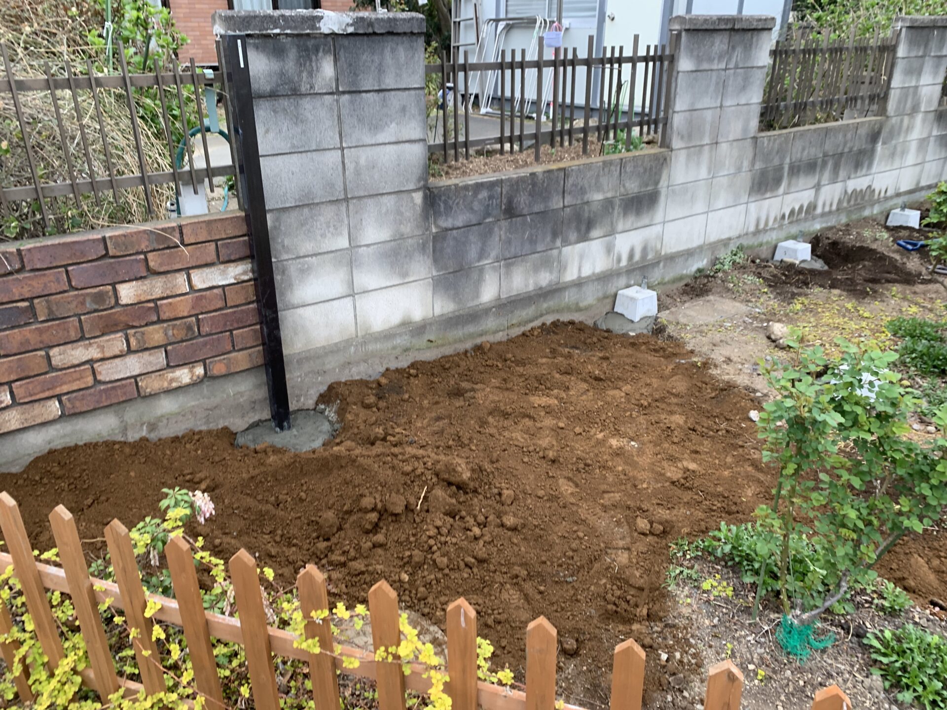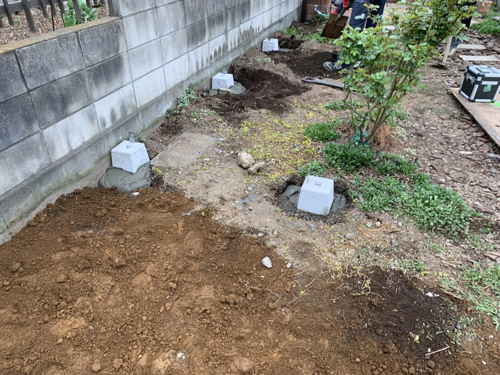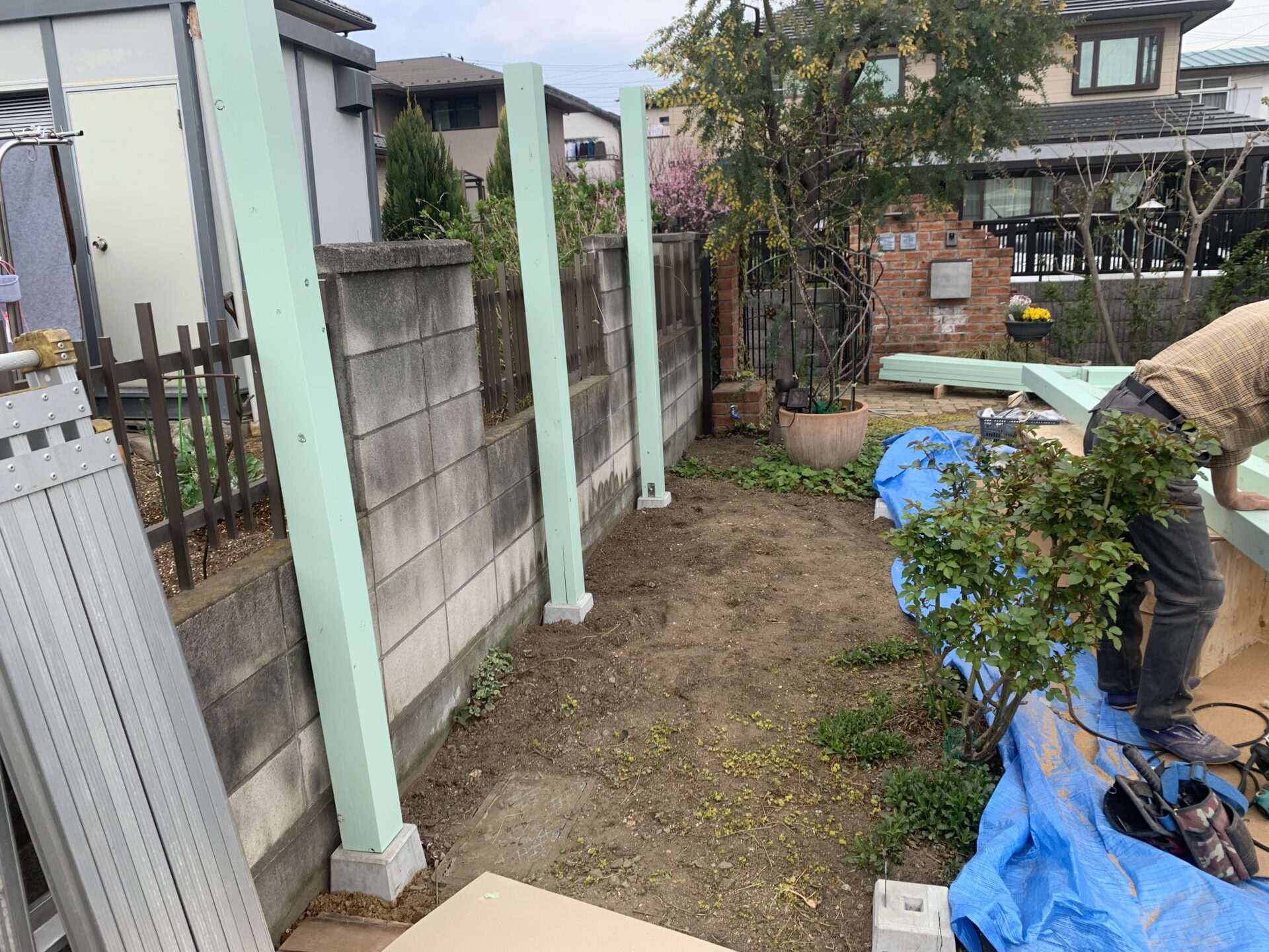 最初の工事はパーゴラの基礎となる束石の設置とフェンス側のアルミ支柱の設置を行いました。