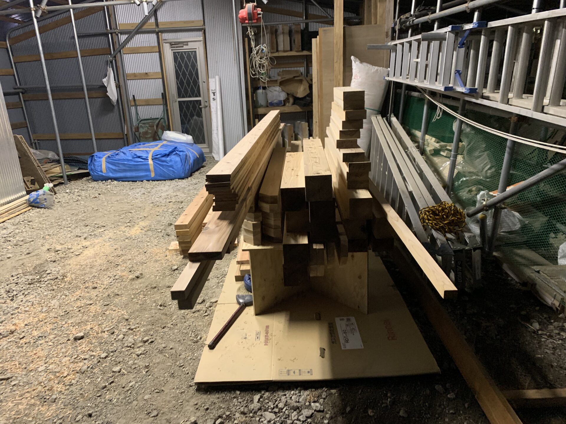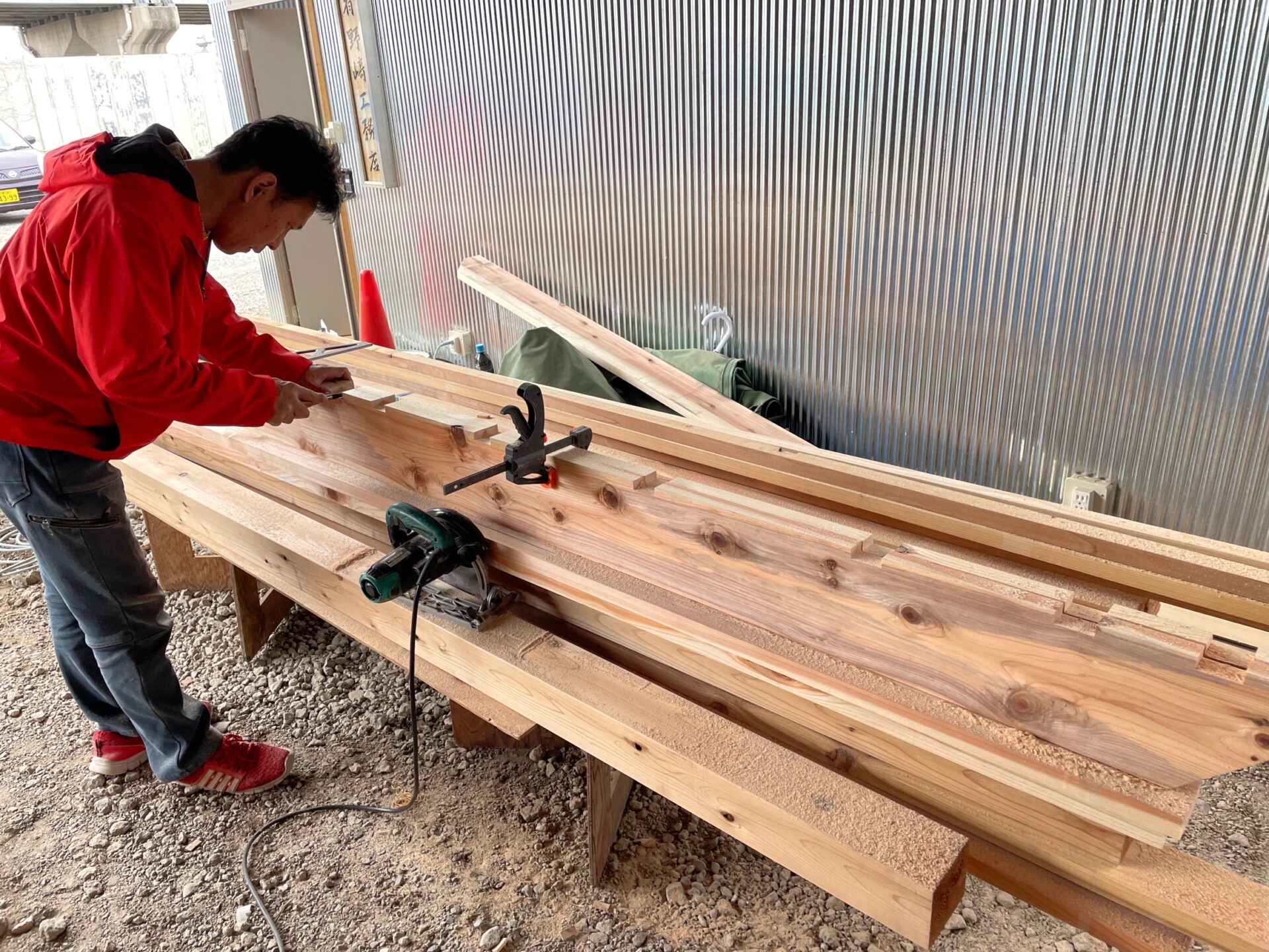 次に加工場で材木の加工、塗装を予め行い現場にて組立になります。