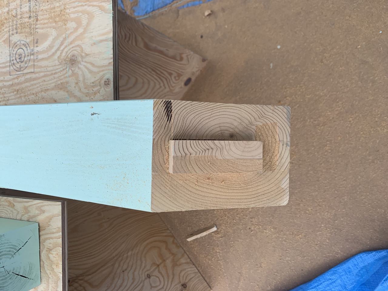 パーゴラの構造を補強するため柱にホゾ穴をあけ、筋交材をほぞ加工していきます。