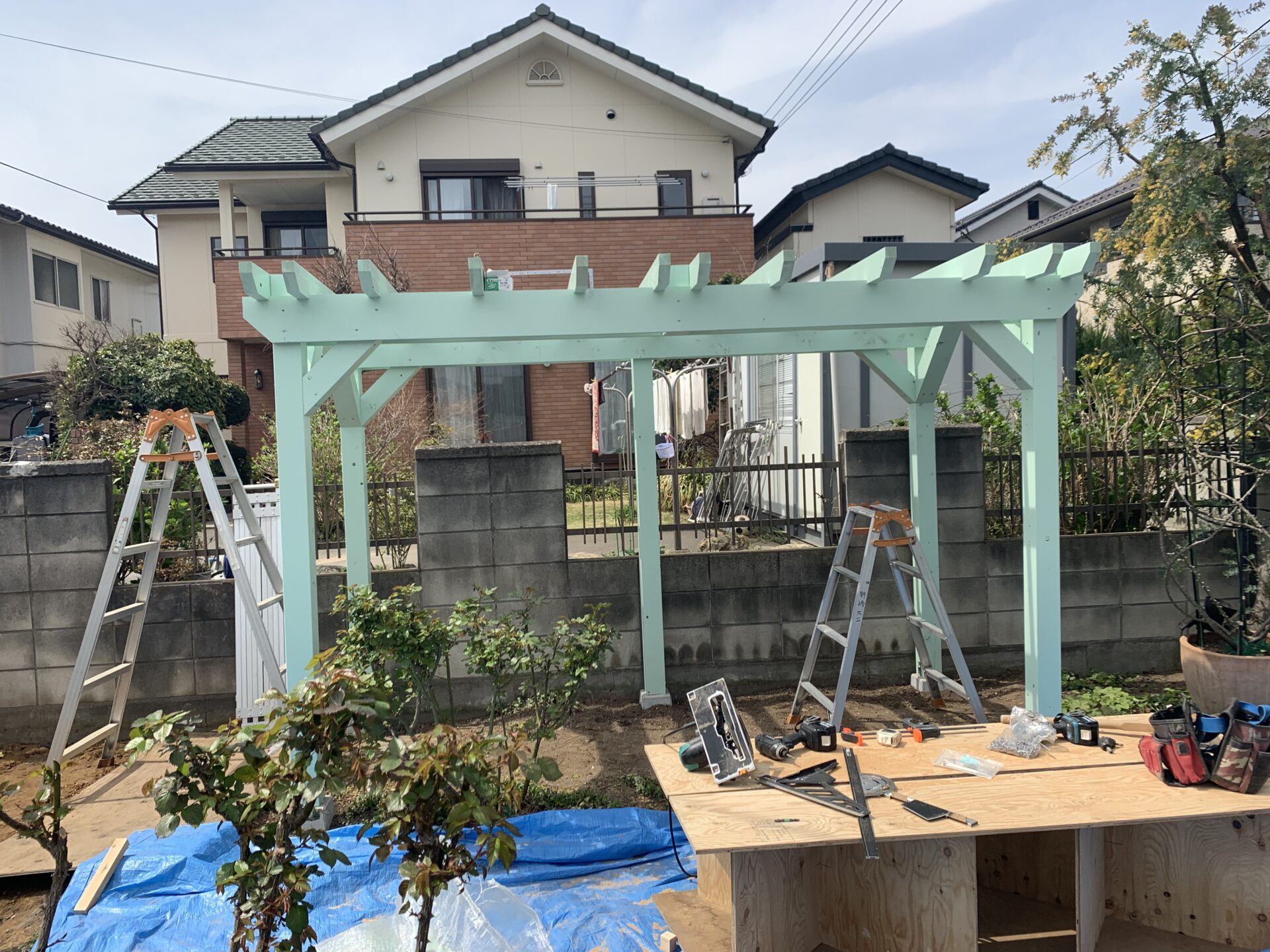 ガーデニングがご趣味の仲良しのご夫婦の奥様からお庭にパーゴラ作りたいと依頼をして頂きました。