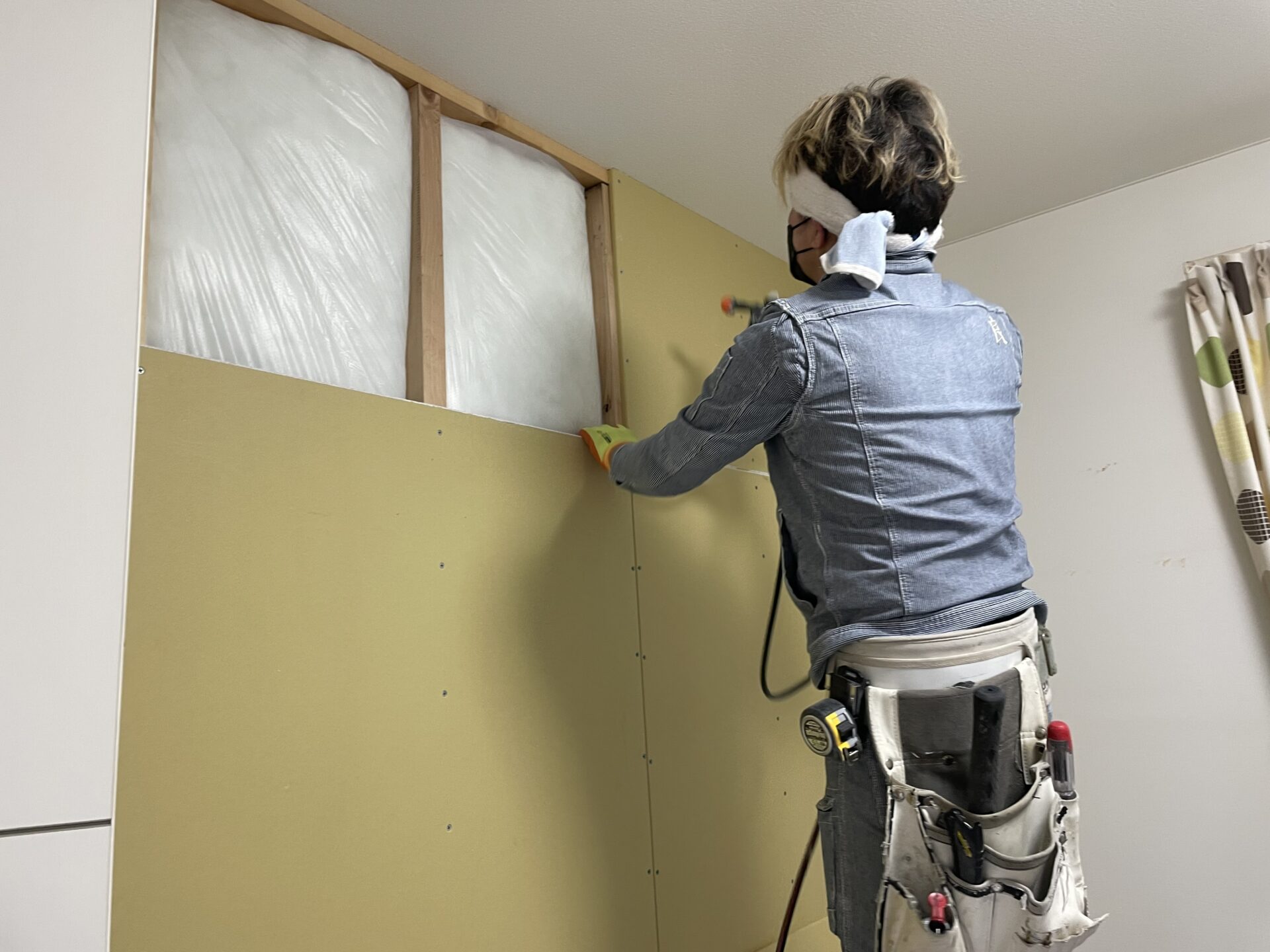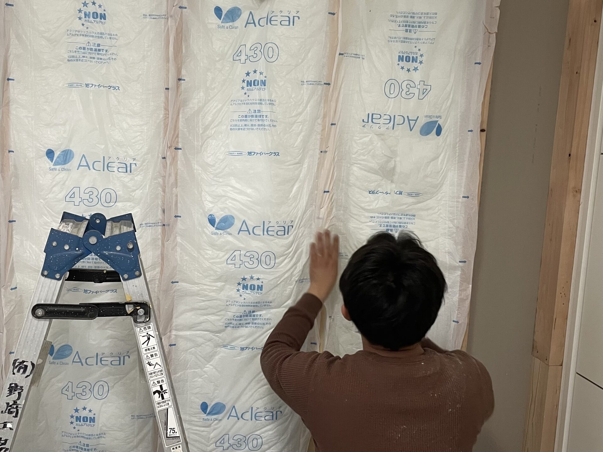 「壁を作るなら防音対策はした方がいいよ」と代表が薦めてくれたので、余っていたグラスウールを入れてもらいました!グラスウールは断熱材ですが、防音対策としての役割もあります。
