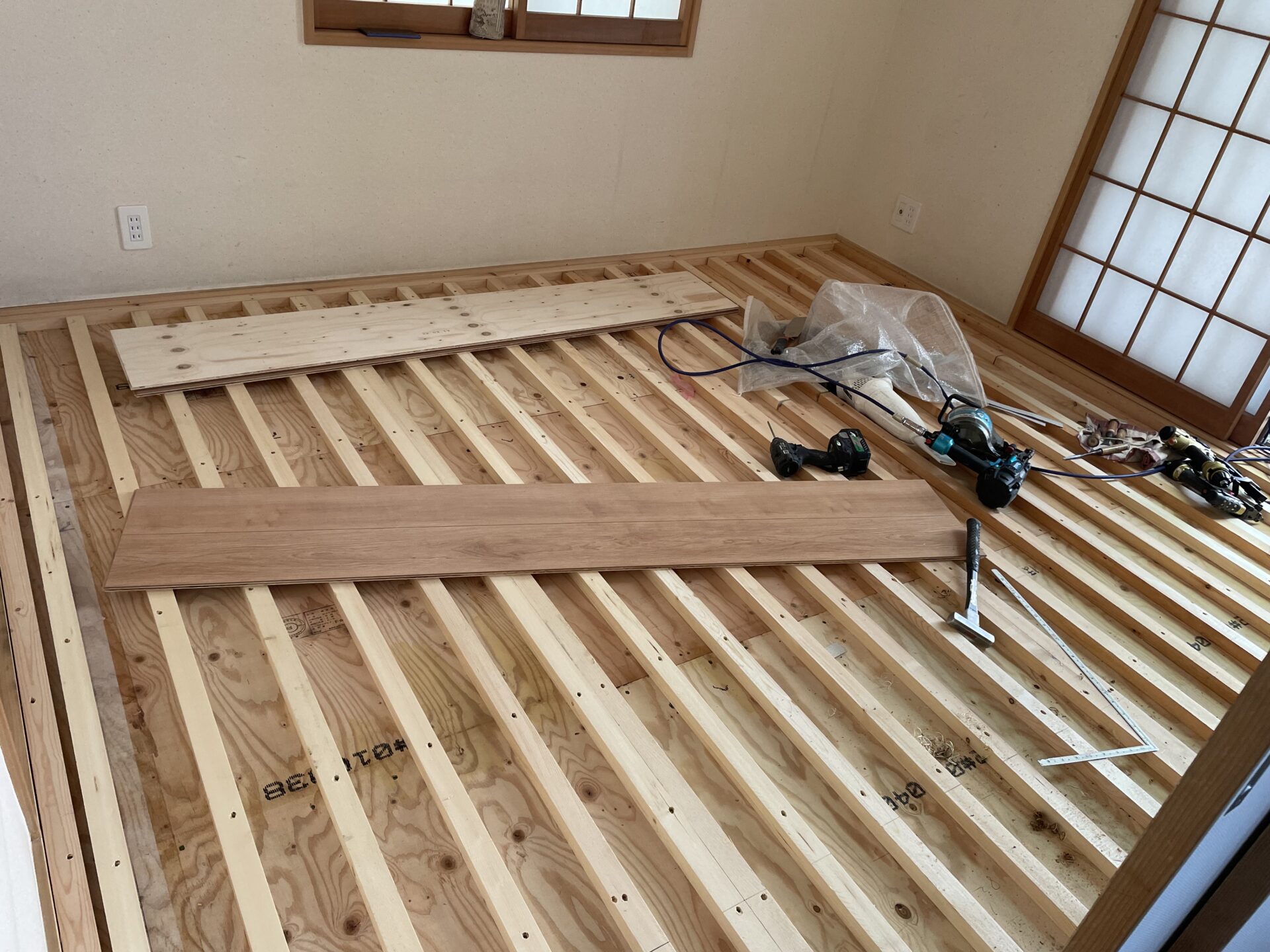 この後フローリング材をカットしながら貼っていったのですが、この日は塗り壁工事と同時進行だったため写真がとれておらず…。