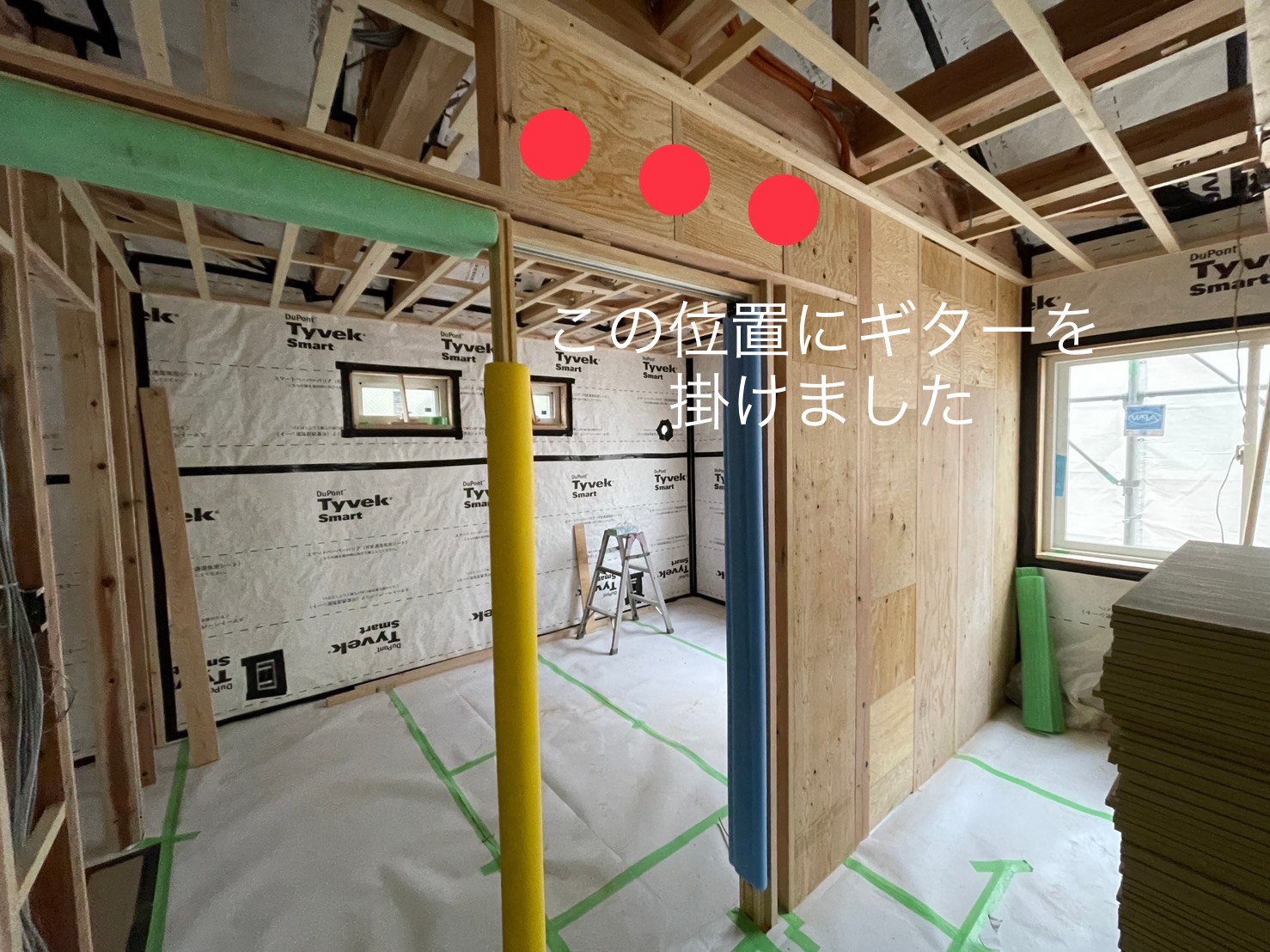 お打ち合わせの段階からギターを飾りたいとのご希望を伺っていたので、予定の部屋にはあらかじめ壁下地を入れておきました。