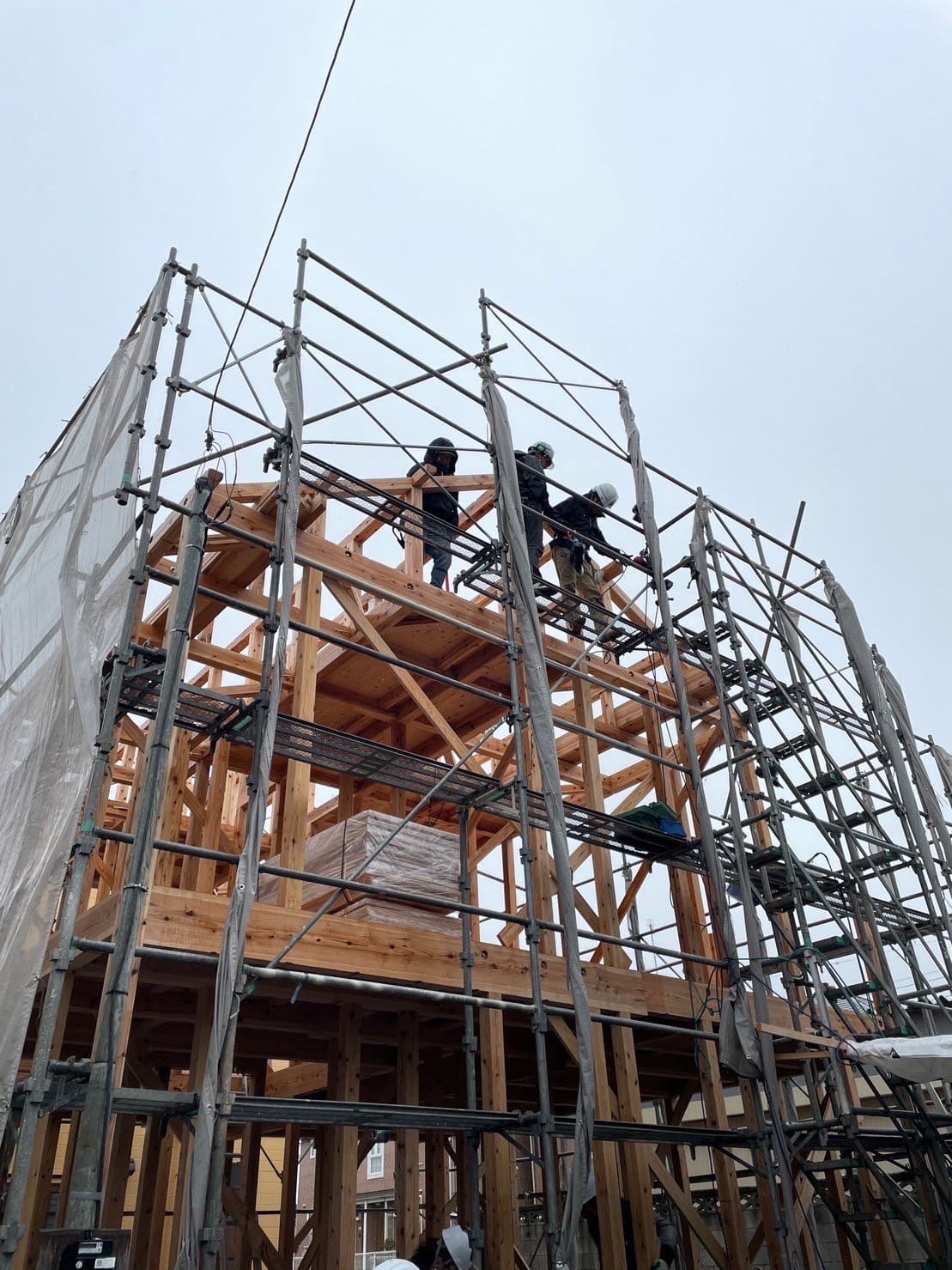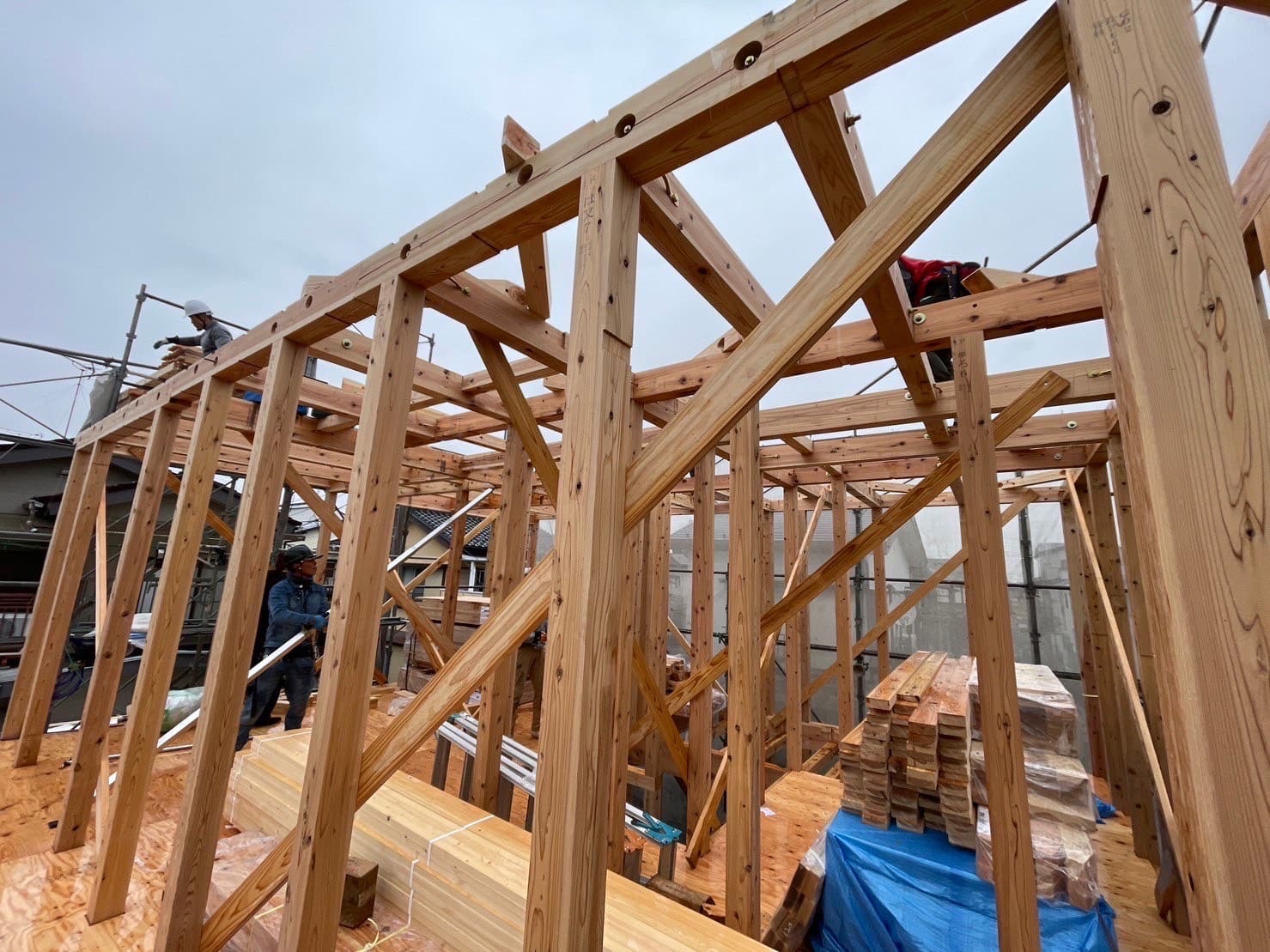 若干の悪天候ではございましたが無事上棟が終わり施主様にも【立派な柱を使っていて!!】と大変喜んでいただけました!!