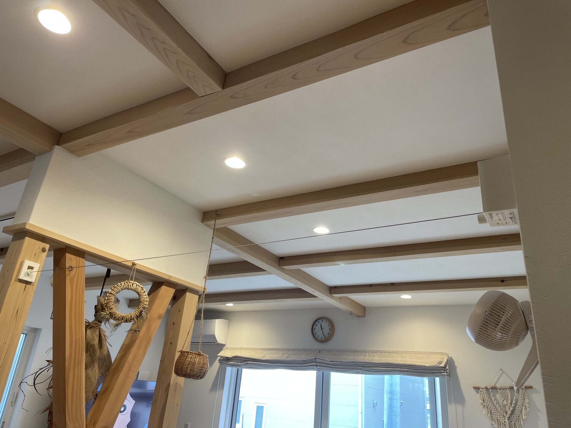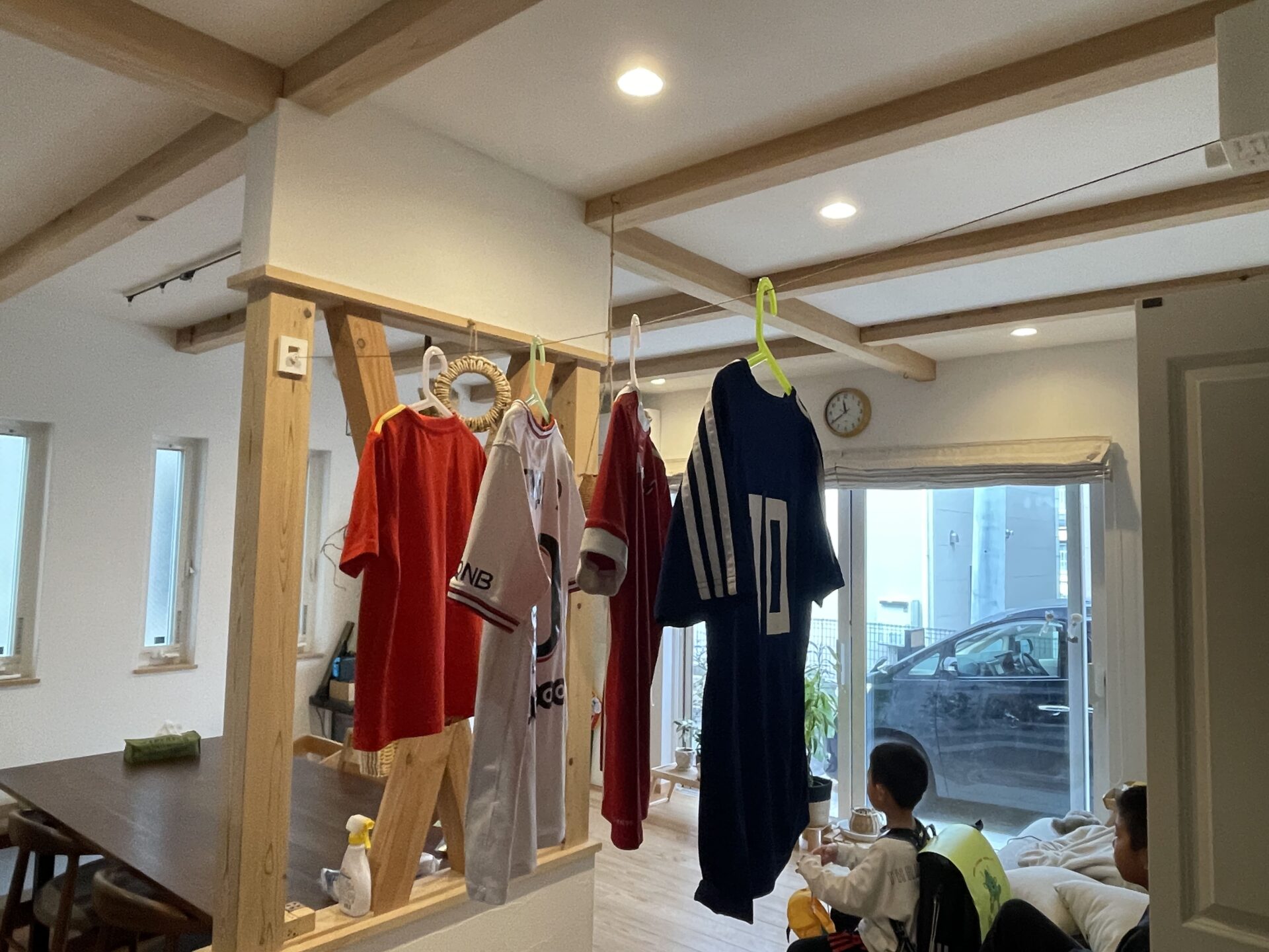 ↓リビングのワイヤー物干し。来客があった時もコートなどもさっとかけられます(^^)/