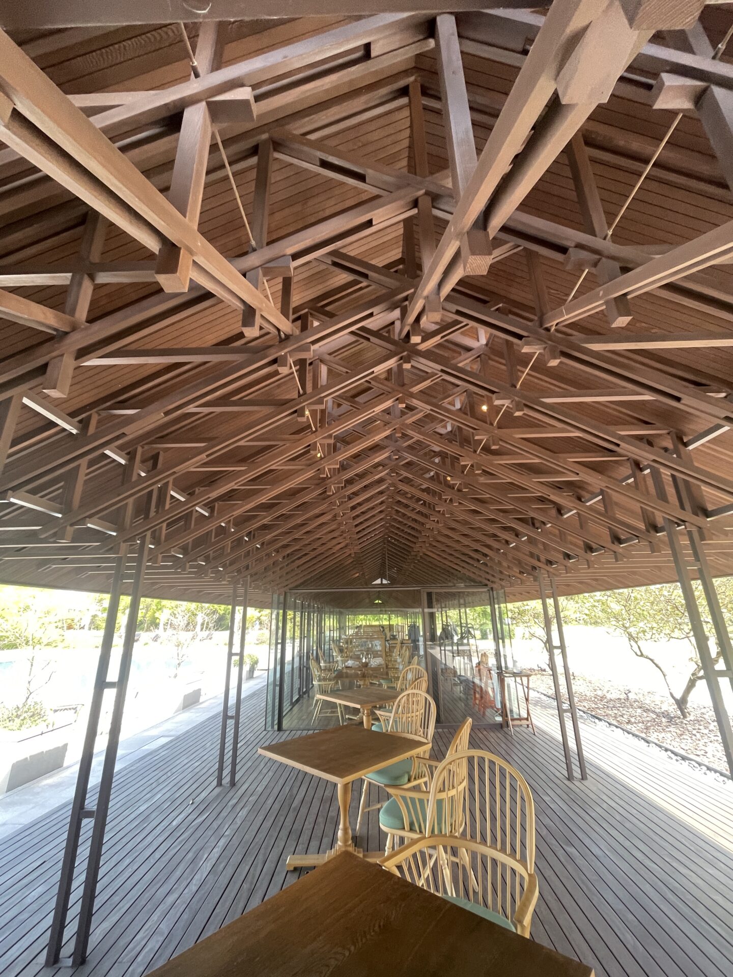 ↑華奢な木材をトラス構造にした小屋組。すごい。
