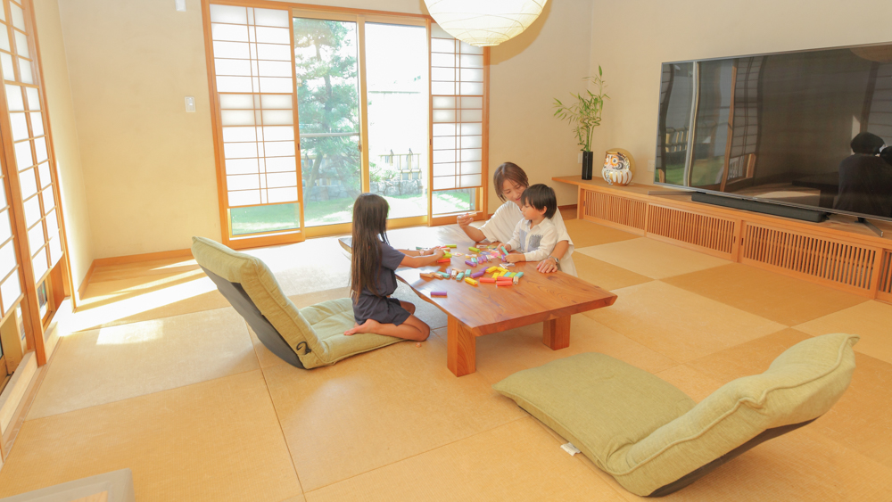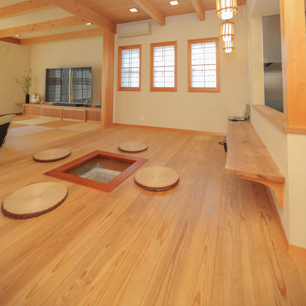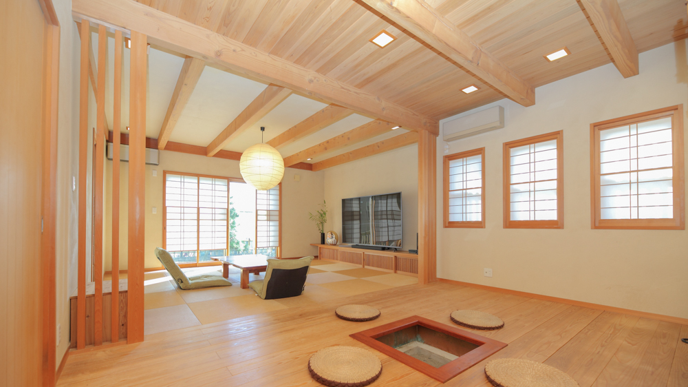 杉無垢材の温もり、漆喰壁の調湿効果、そして琉球畳が織りなす風情あふれる空間は、日々の疲れを癒し、四季折々の美しさを楽しむ場所となります。