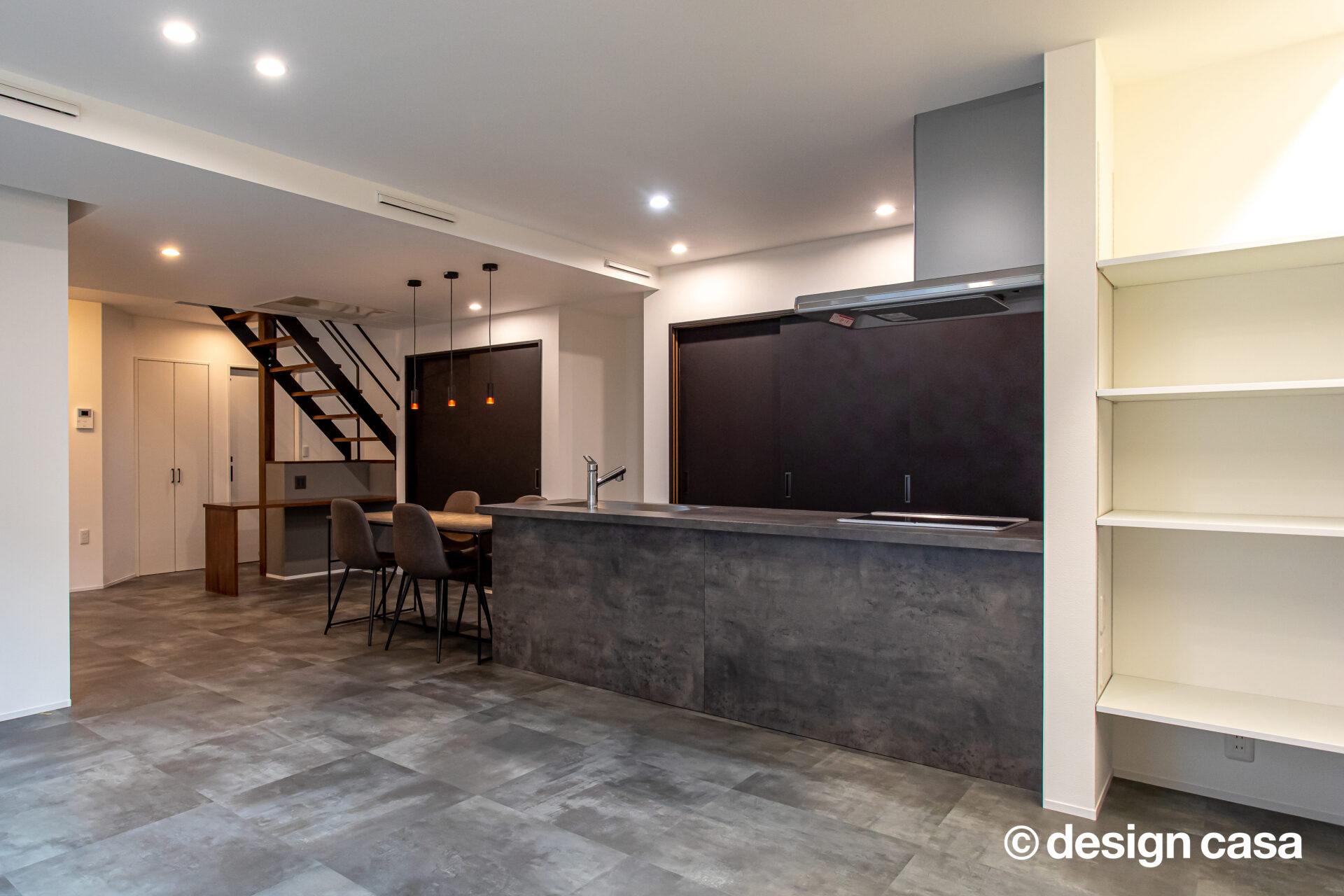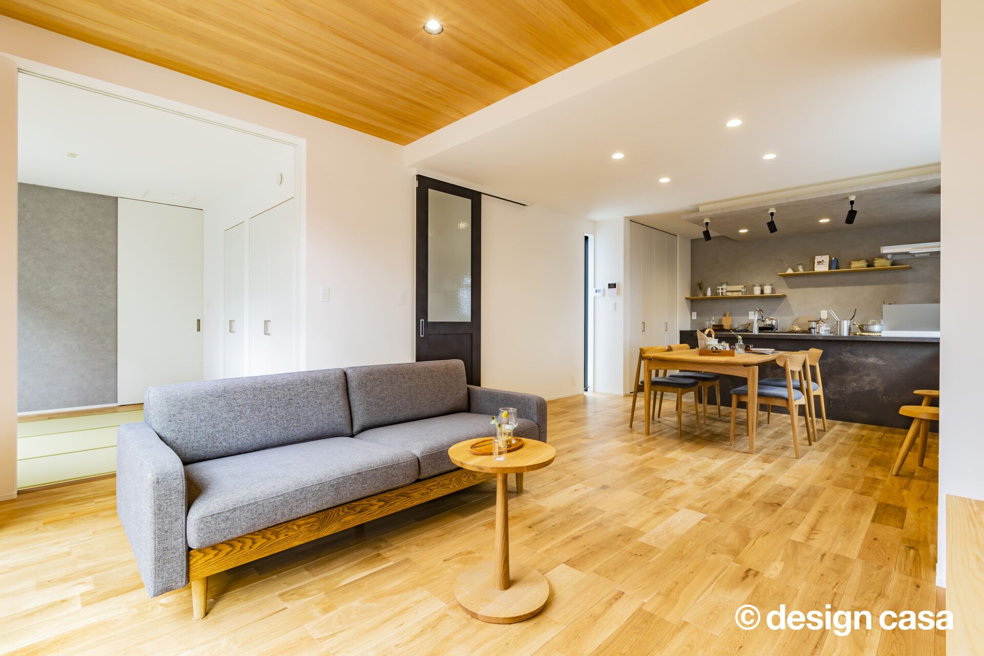 ・リビング・キッチン・ダイニングの天井や床材、壁紙を変えて、視覚的にゾーニング