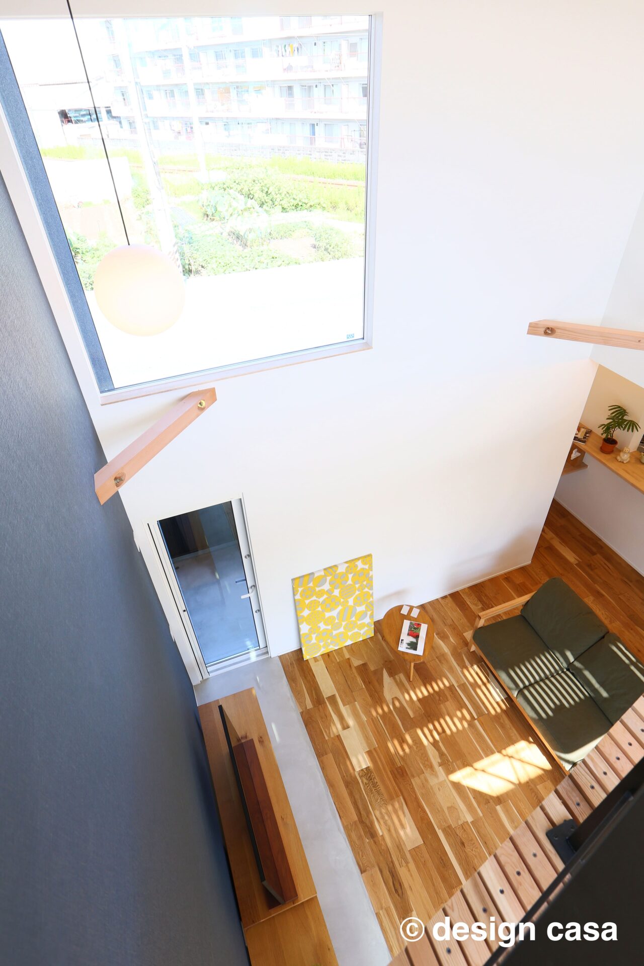 ・ブラックのアイアン×木の階段が玄関上に。スタイリッシュで省スペース化