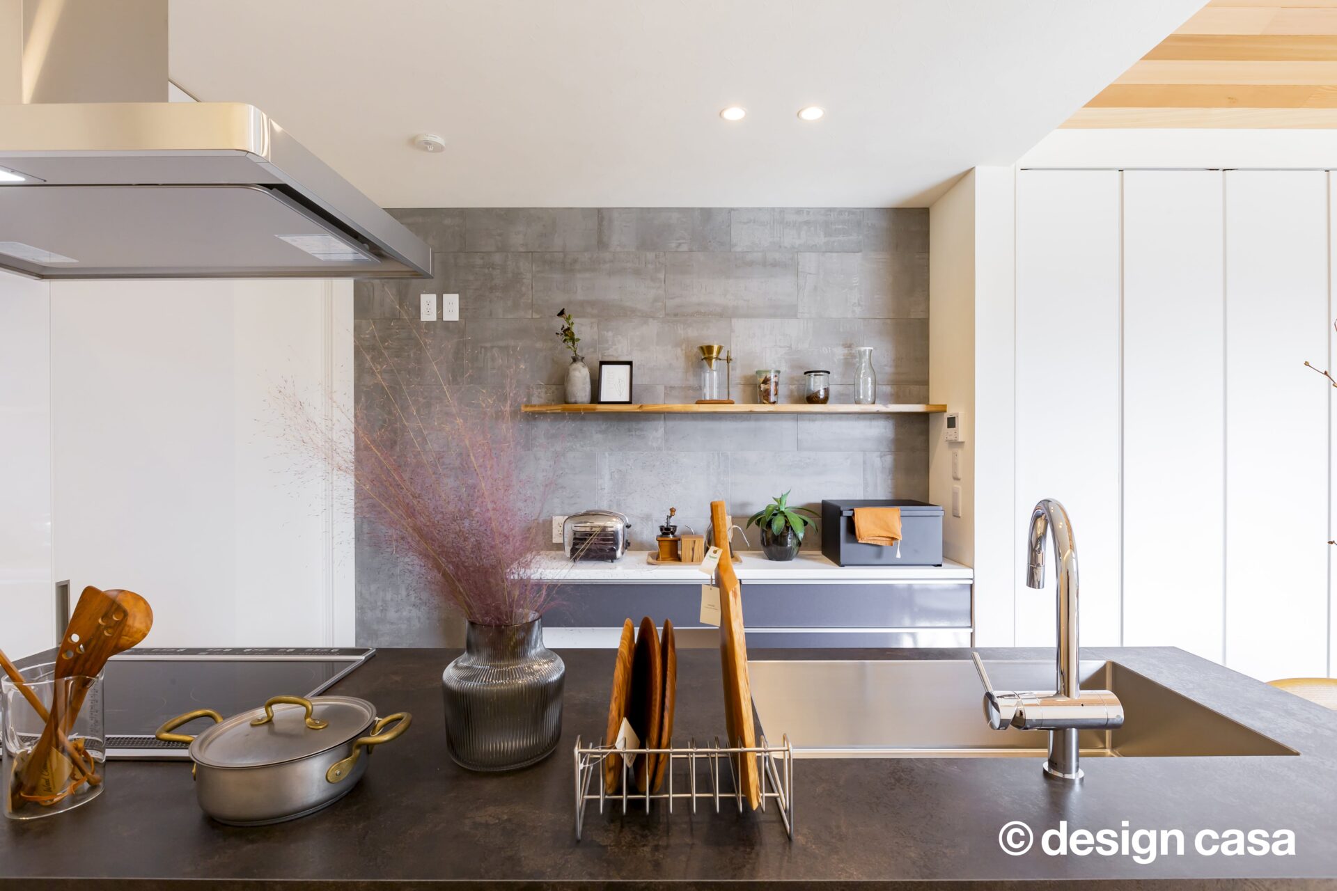 キッチン背面に落ち着きのあるグレーを効かせて、空間にほどよい緊張感と奥行きを。洗練されたトーンが、キッチンをモダンな雰囲気に引き締めます。