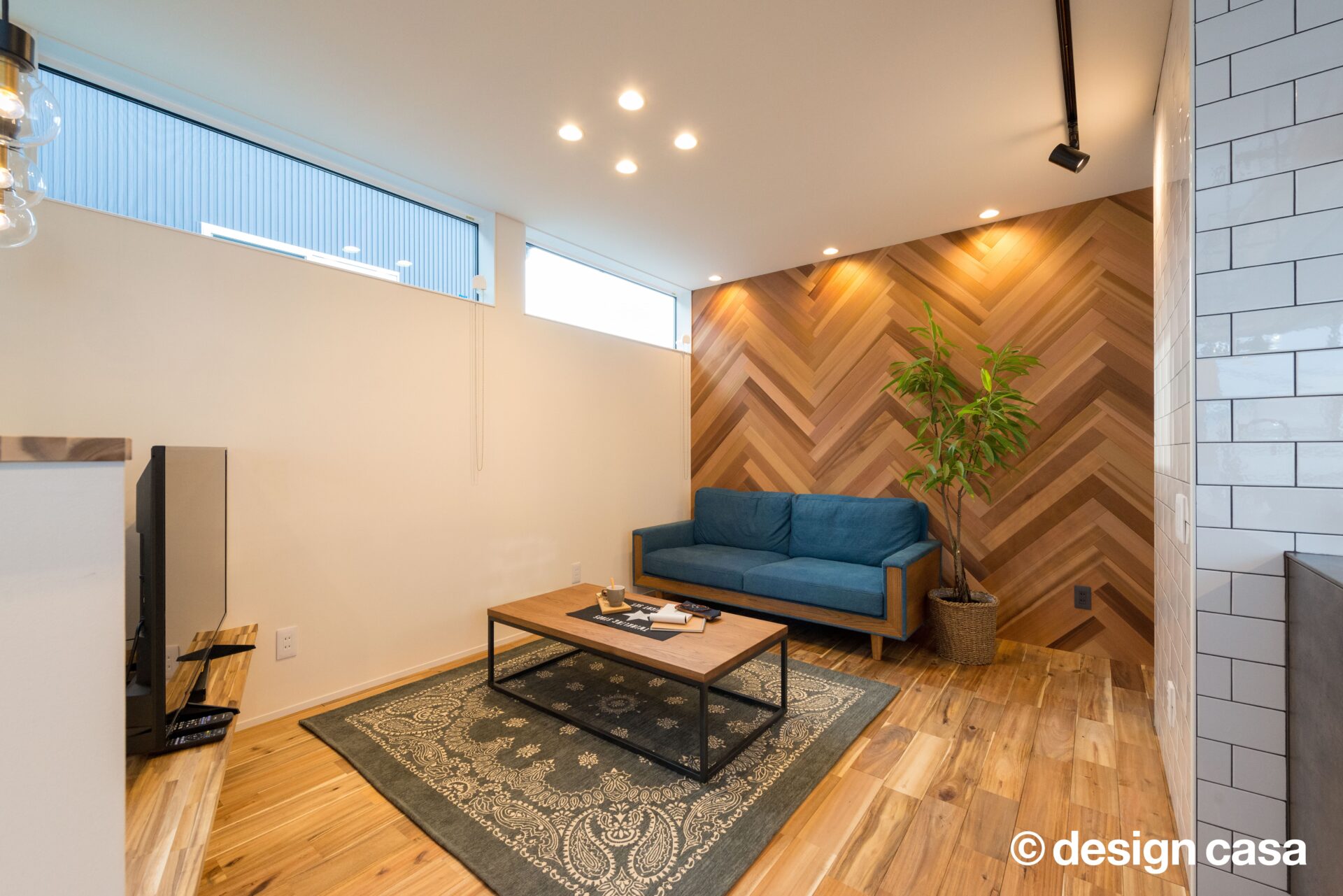 ヘリンボーン柄の木目が生むリズムと温もりで、リビングに上質な表情をプラス。シンプルな空間の中で、視線を集めるおしゃれな主役の壁に。
