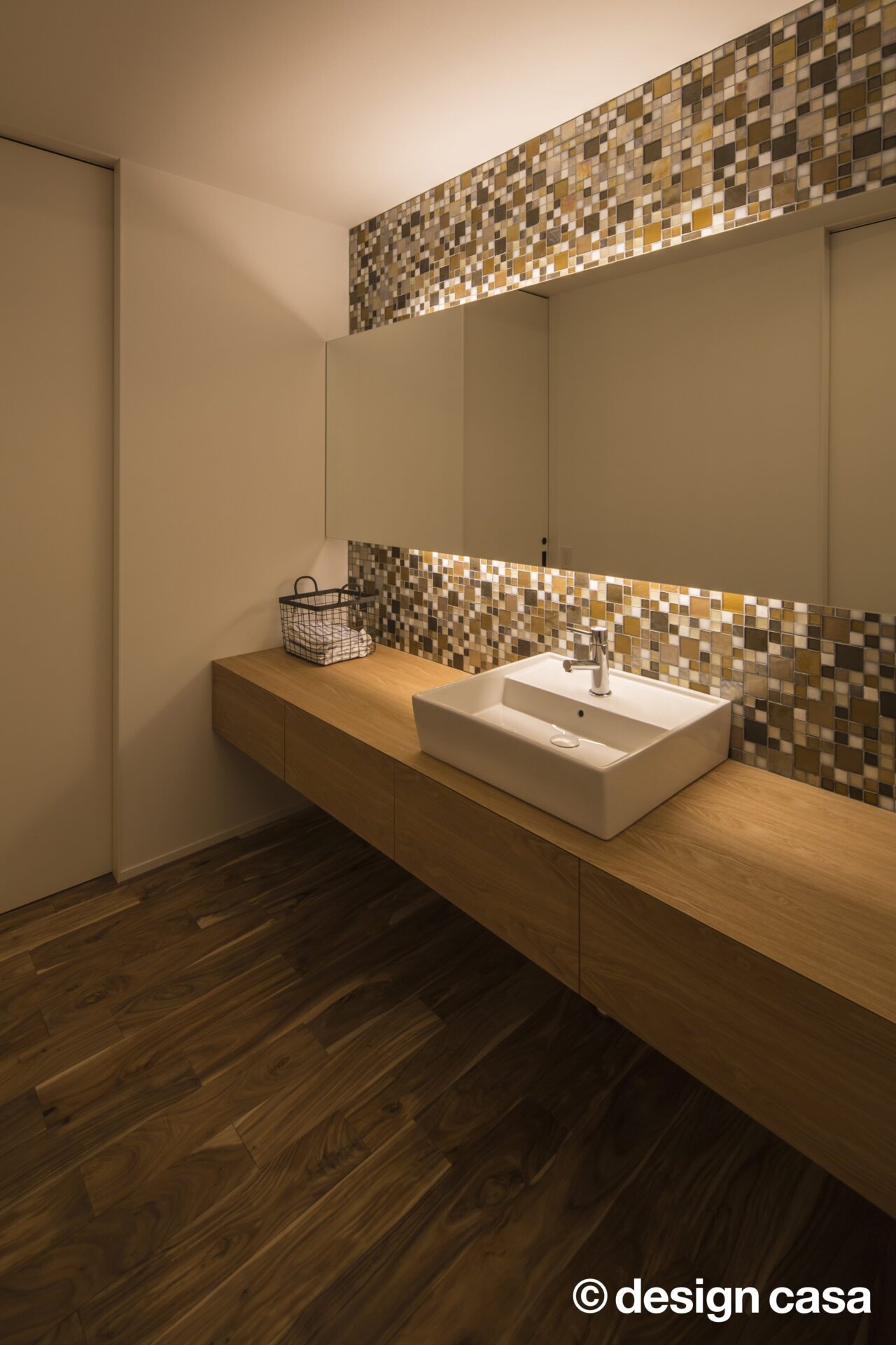 造作洗面台の壁にはモダンなエコカラットを設け、消臭・湿気対策+デザイン性を実現。間接照明との相性も抜群。