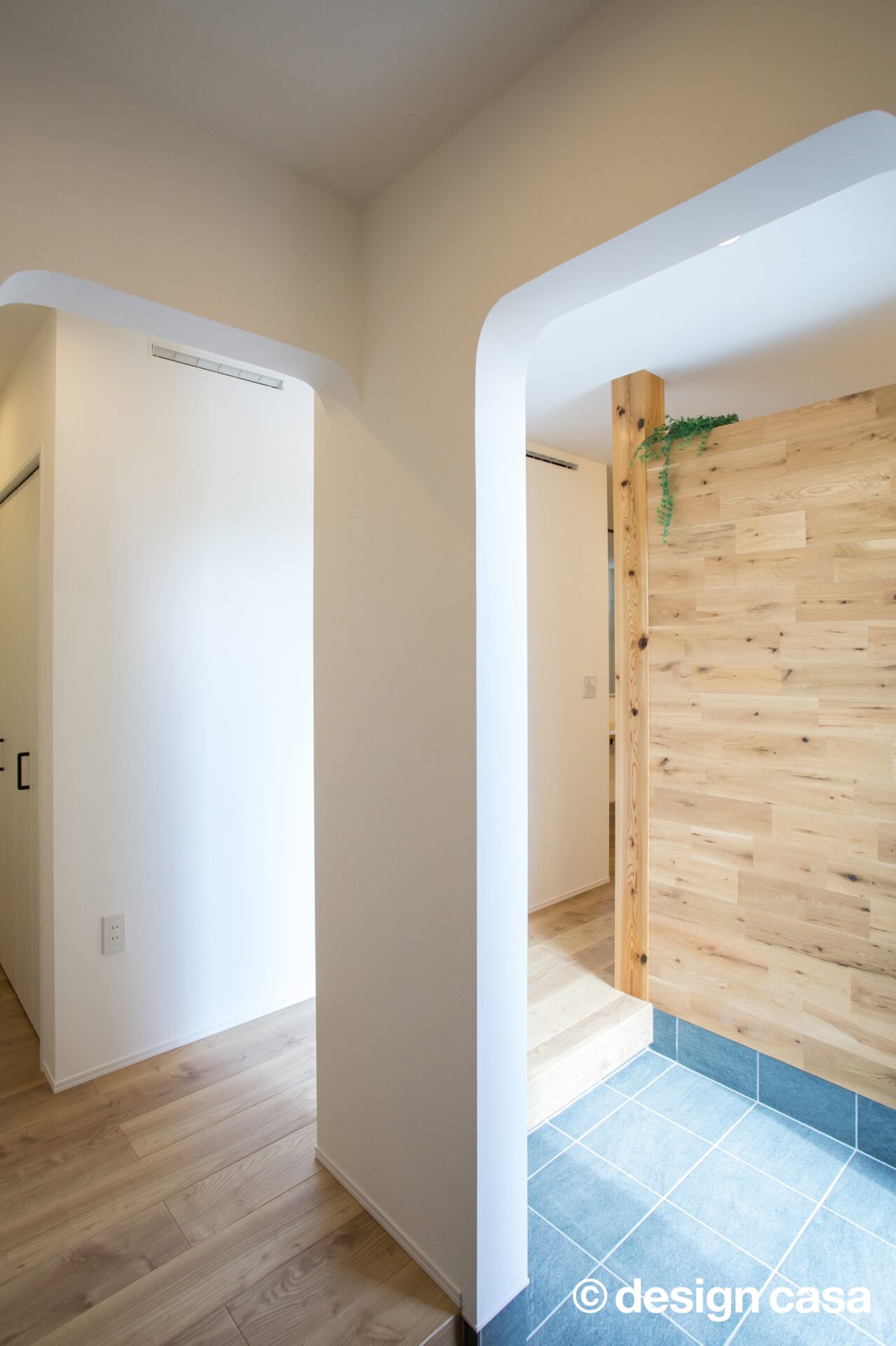 玄関からリビングへの通路にアーチ型の垂れ壁を設けることで、柔らかく温かみのある雰囲気を演出。