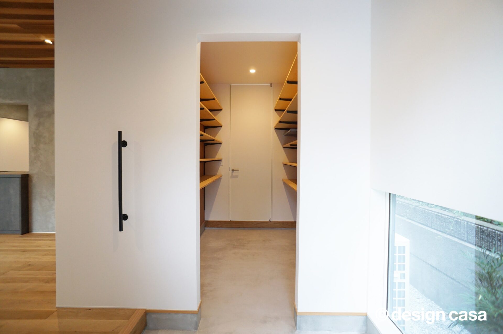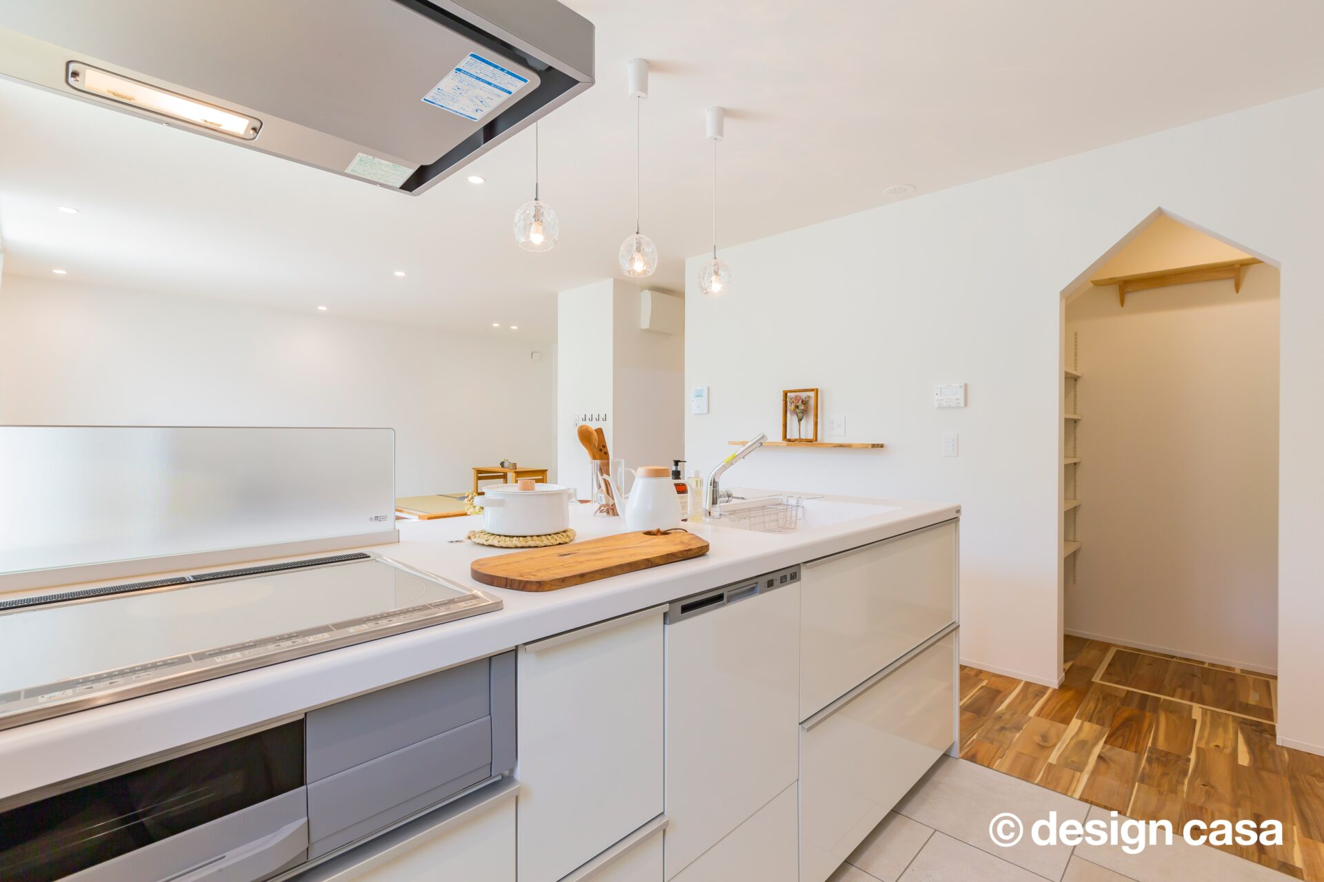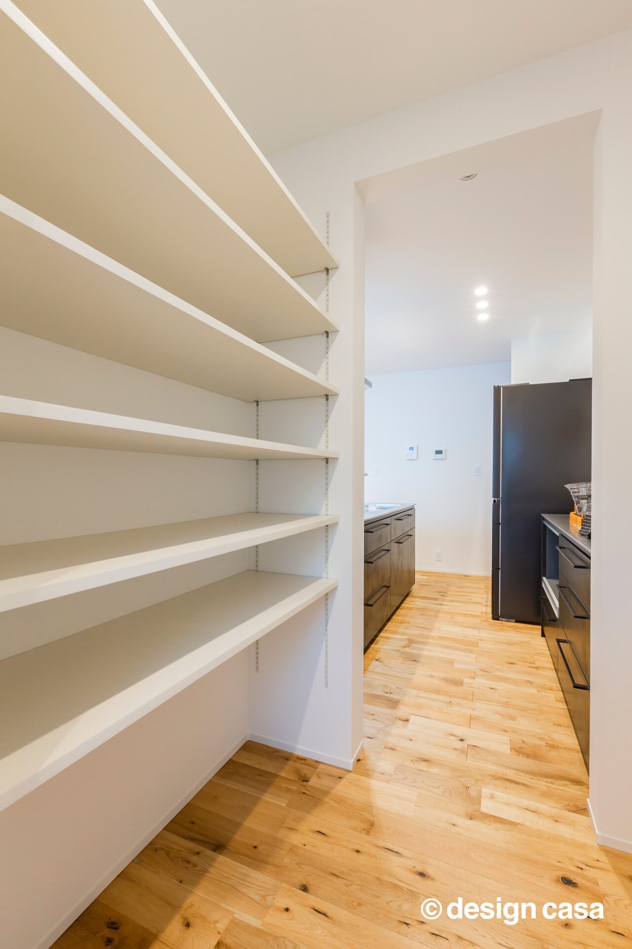 キッチン横のパントリーにストレートな垂れ壁を設け、空間をすっきりと仕切りつつ、開放感を保っています。