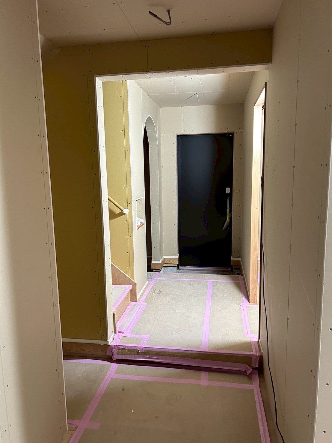 今回は現在進行中のお住まいから、石膏ボードが施工され、各空間の形状がはっきりと見えてきました!