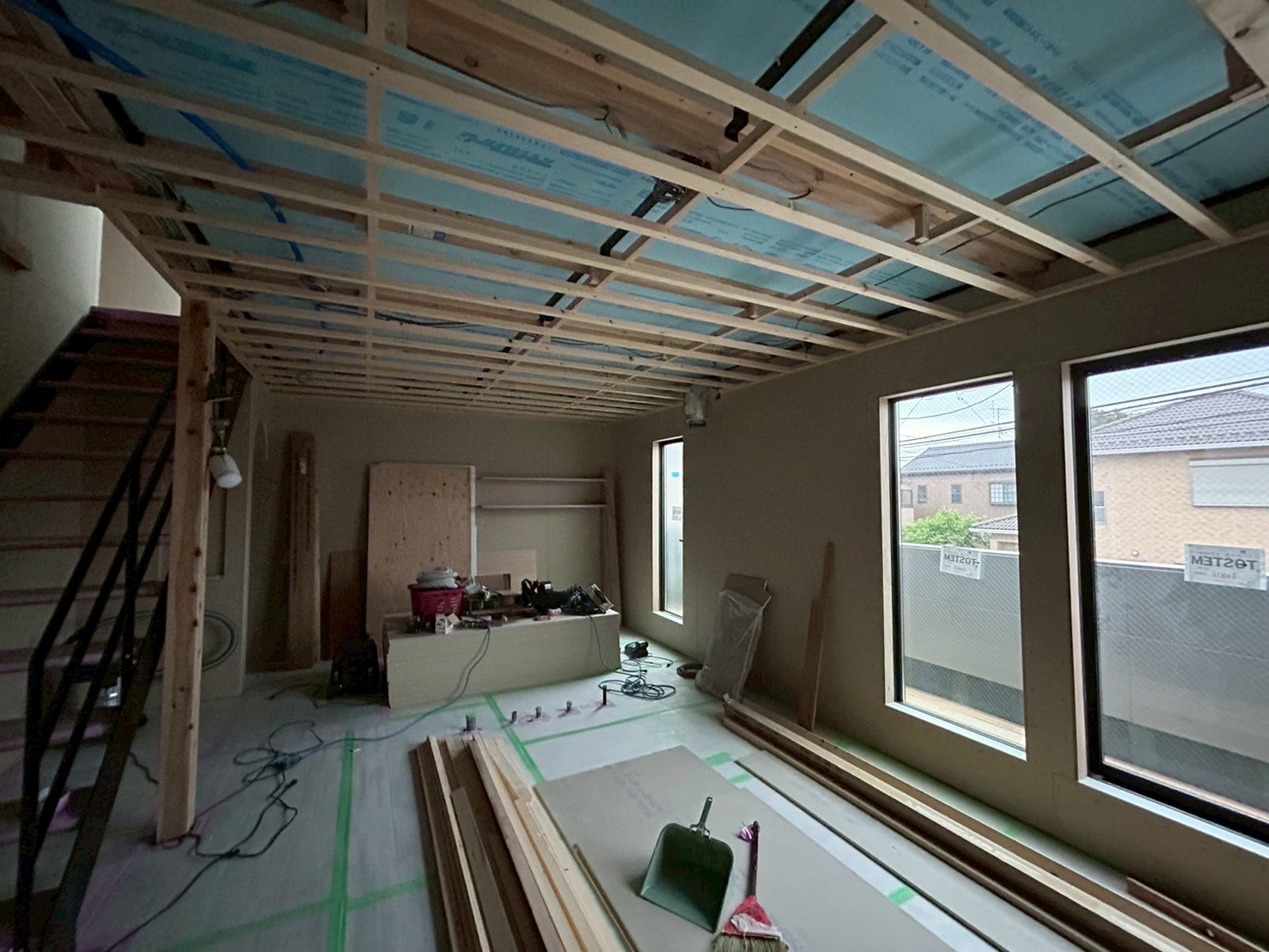 現在、石膏ボードの施工が進行中で、各空間の形状がはっきりと見えてきました。
