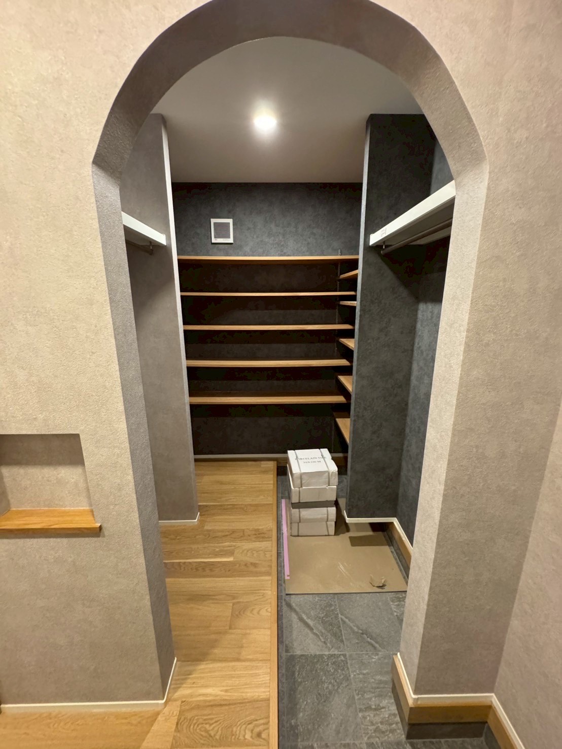 その先の土間収納は、垂れ壁で空間をやわらかく仕切りつつ、モルタル調のグレーを基調とした落ち着きのある雰囲気に仕上げています。