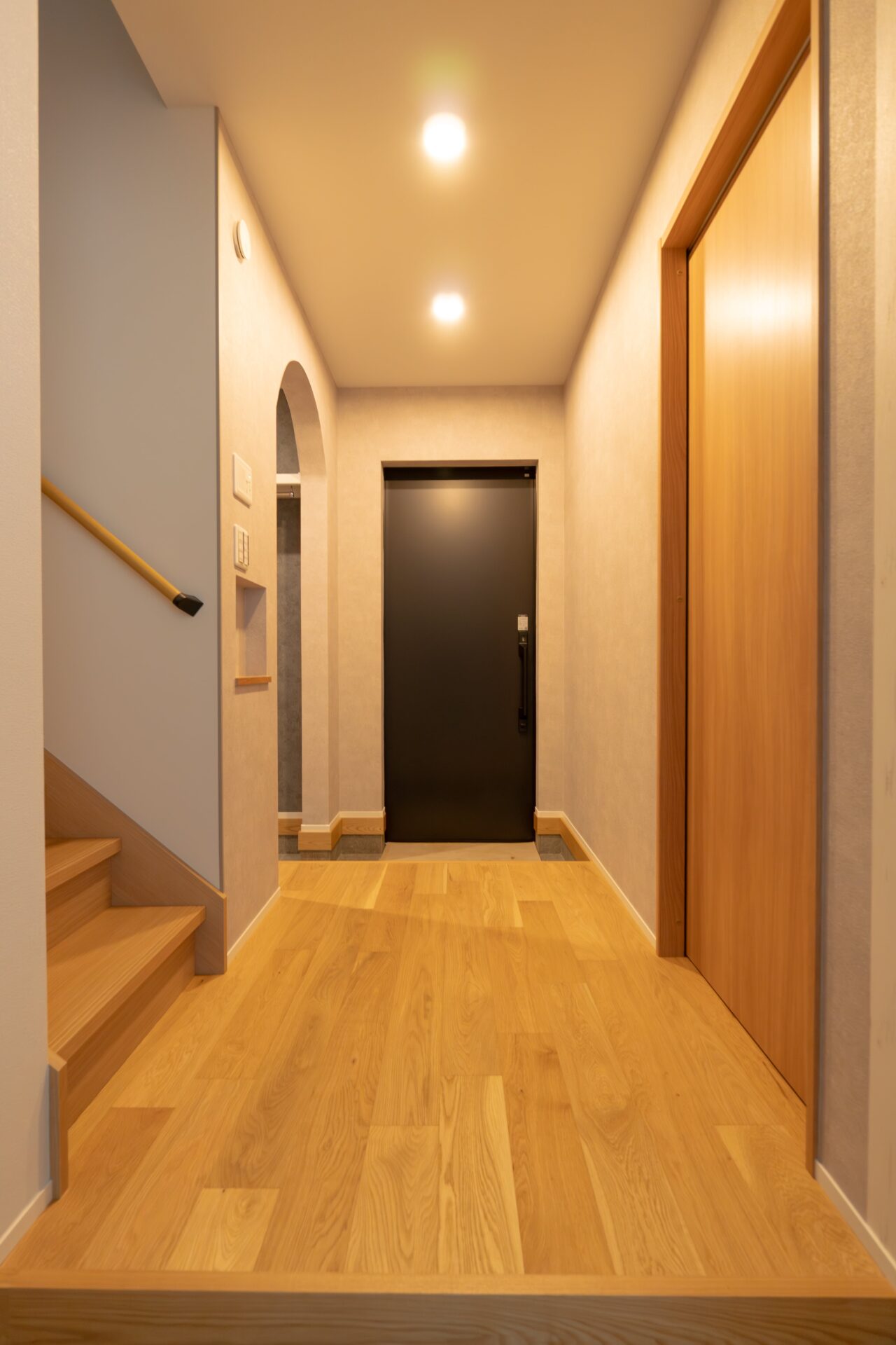 動線設計:家族専用のセカンドエントランスを設け、来客と生活の動線を分離。R垂れ壁の土間収納も
