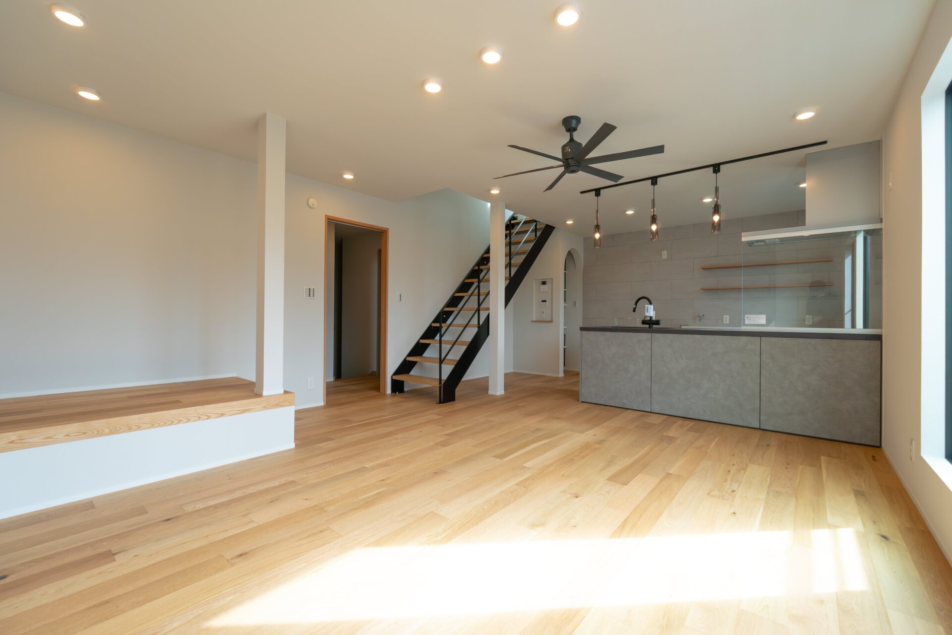 オーク床が広がる約17帖越えのLDK。素材の組み合わせで空間にリズムを。
