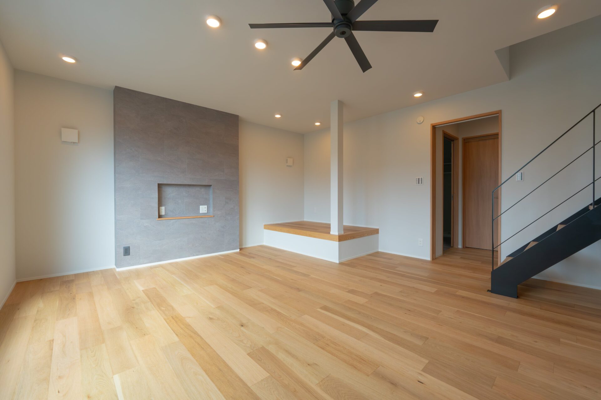 リビング:小上がり&石目柄タイルで視覚的なアクセント