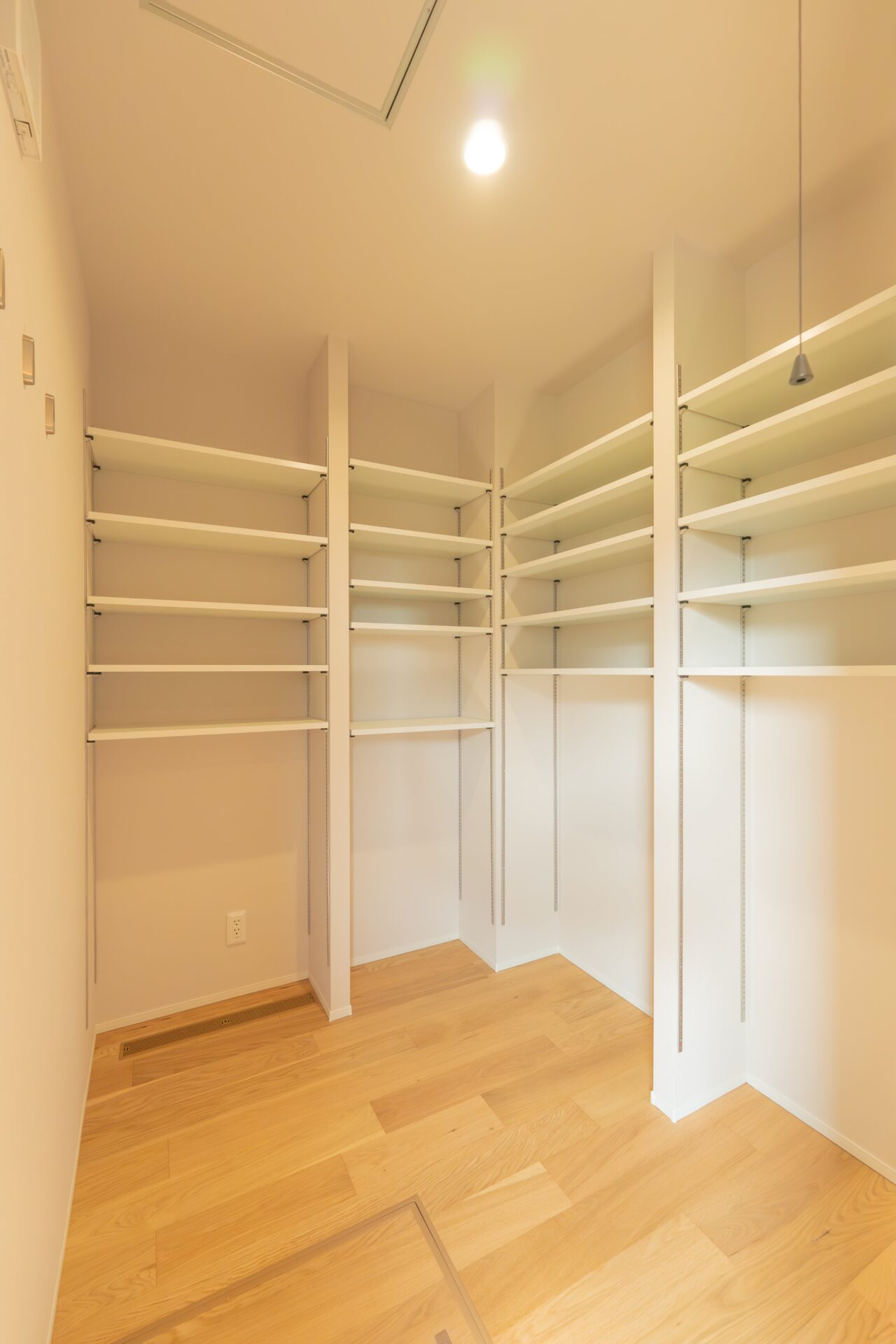 収納:勝手口とパントリーを組み合わせ、日々の動線をスムーズにしつつ、食品や日用品もたっぷり収納できる機能性