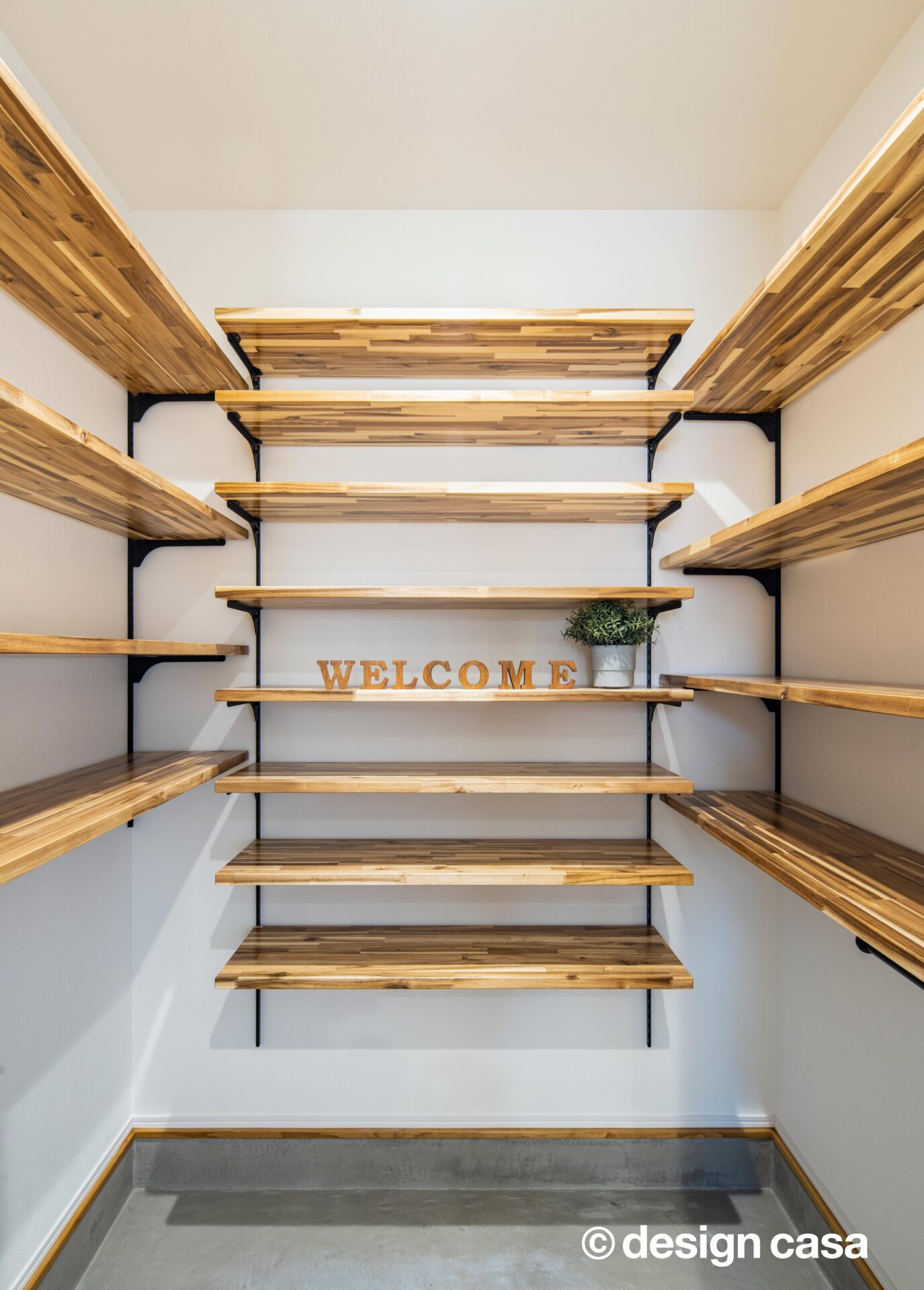 可動棚は木目調にして温かみを出し、ウェルカムボードや小物を組み合わせれば、玄関の一角「趣味のギャラリー」に。