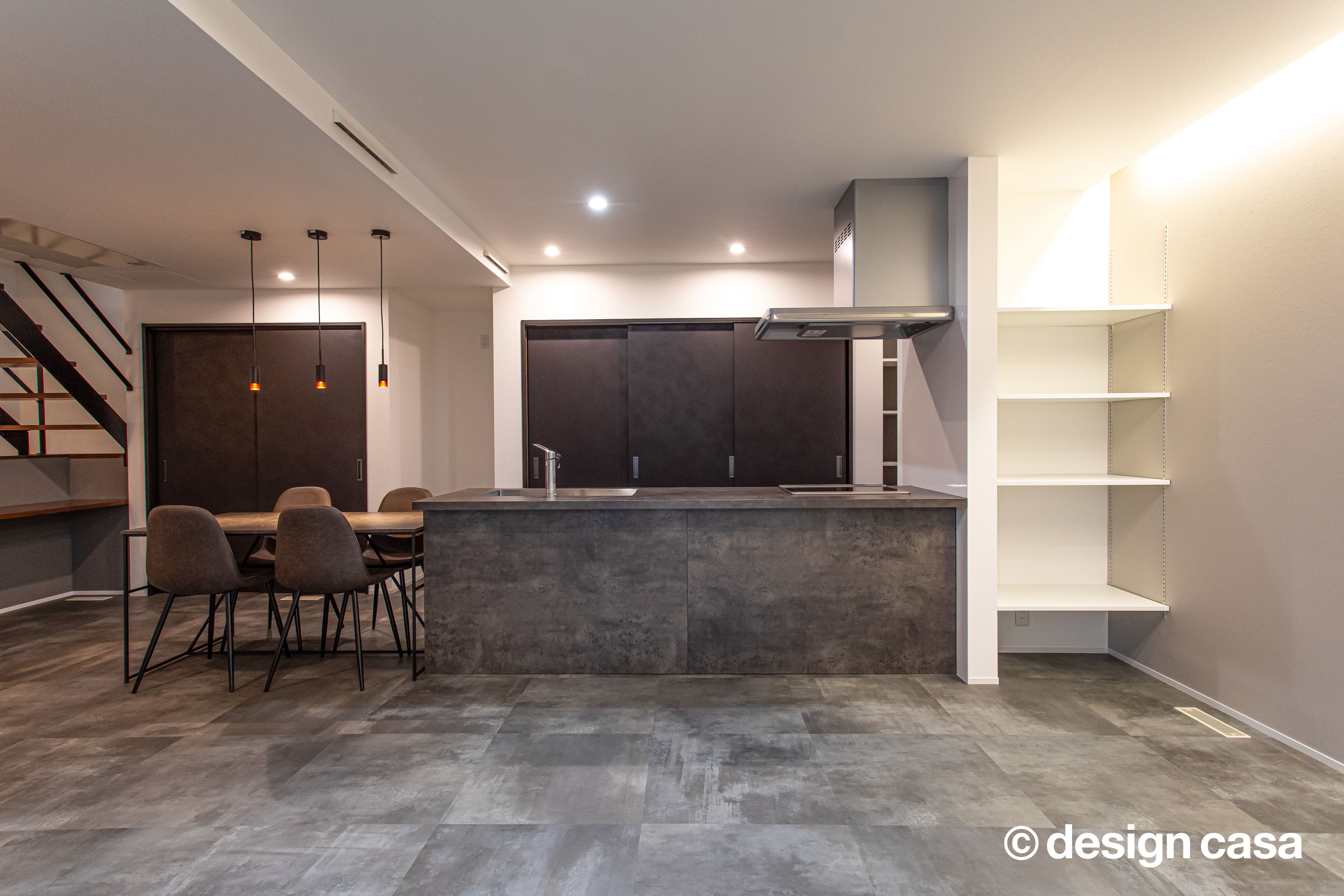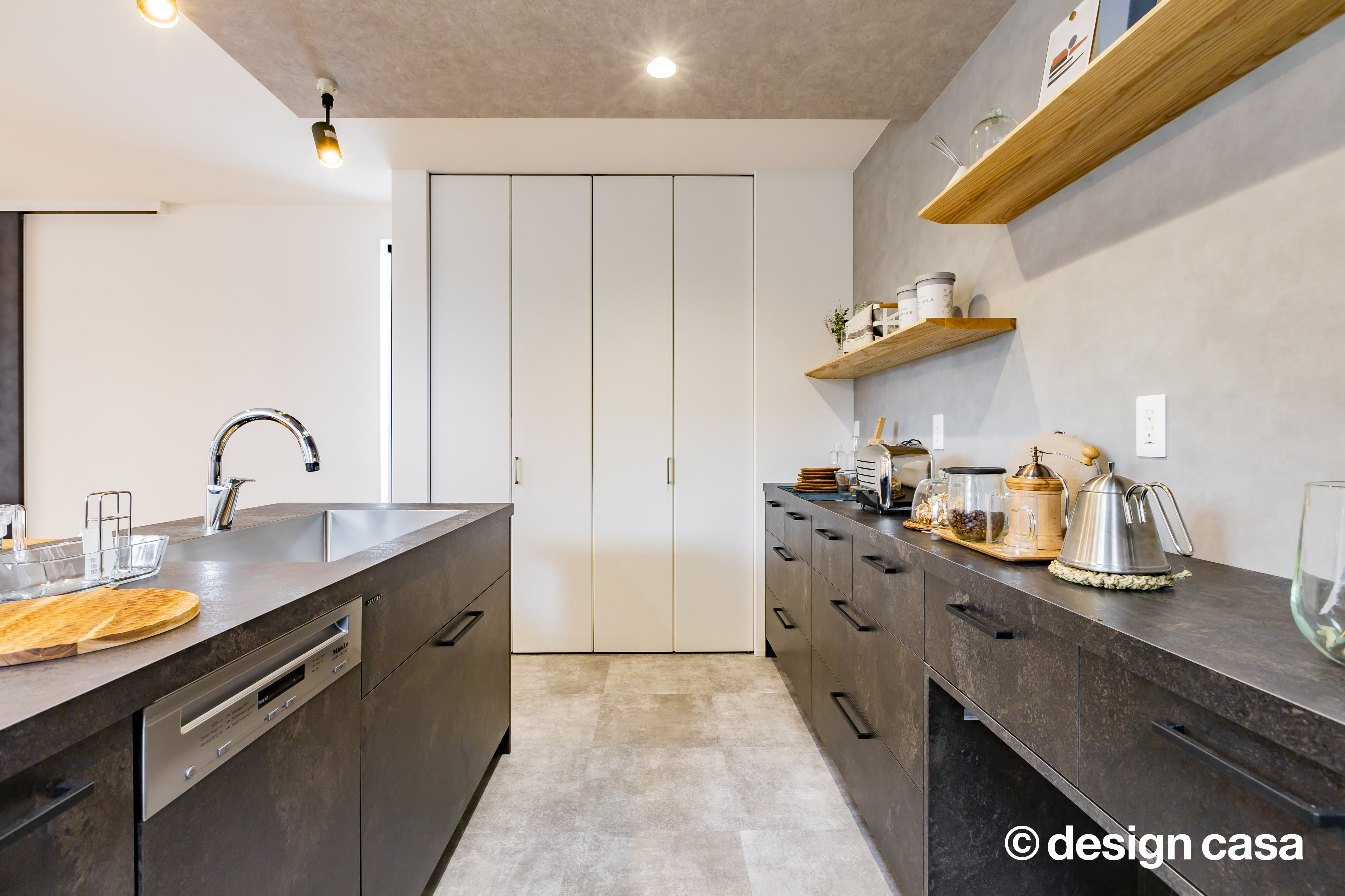 ① キッチン背面は「魅せる」、パントリーで「隠す」を両立