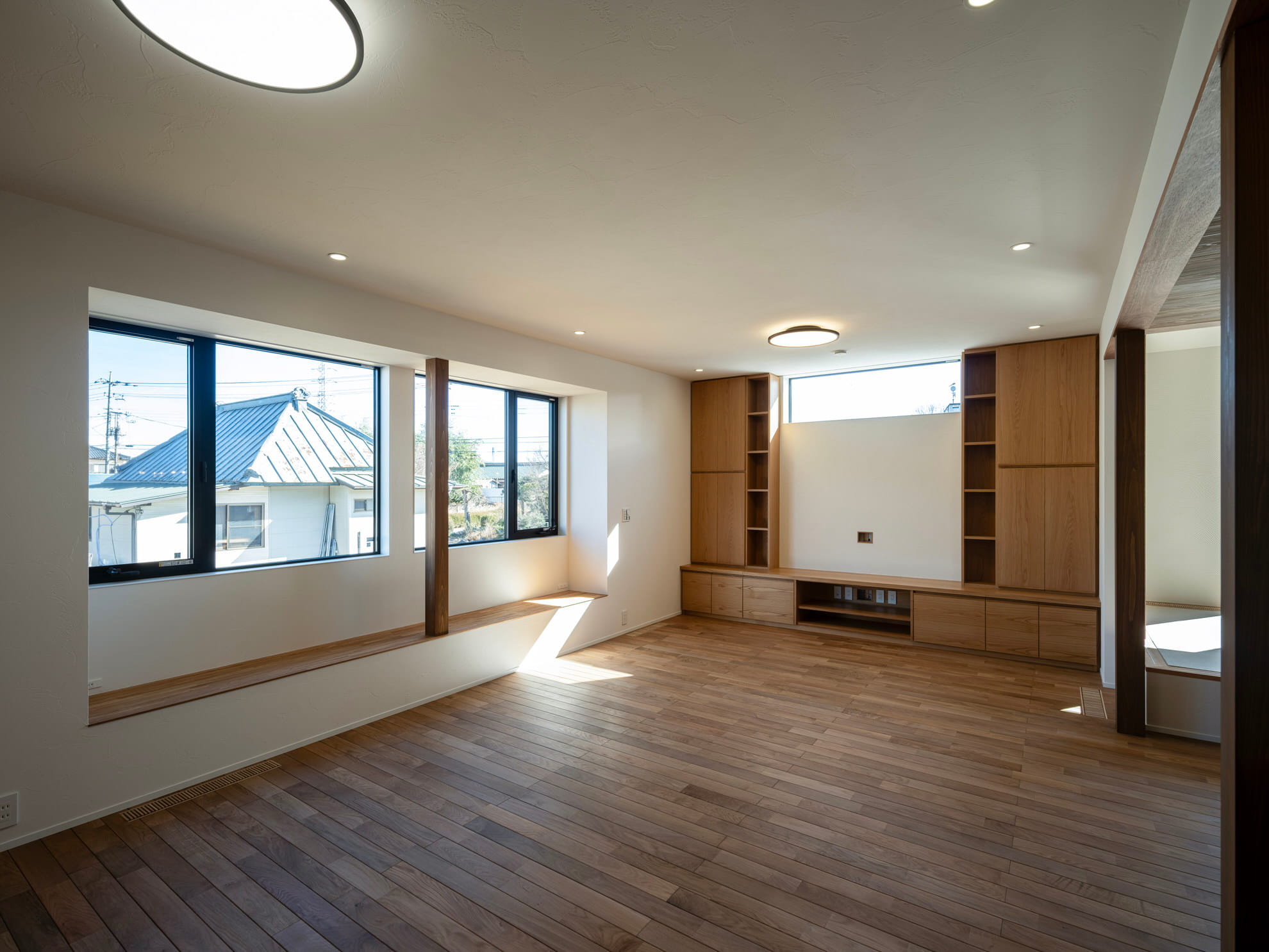 大きな窓辺に設えた造作ベンチが、光と景色をゆったりと楽しめる上質なひとときを演出
