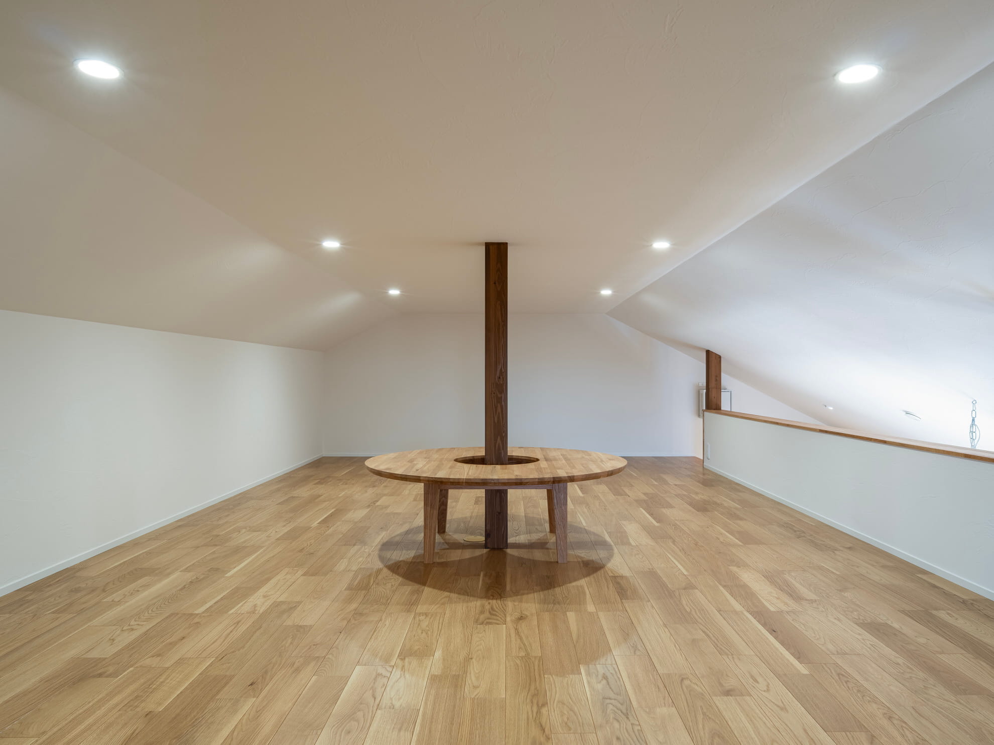 中央に円形のワークデスクを据えた、18帖の広々としたロフト