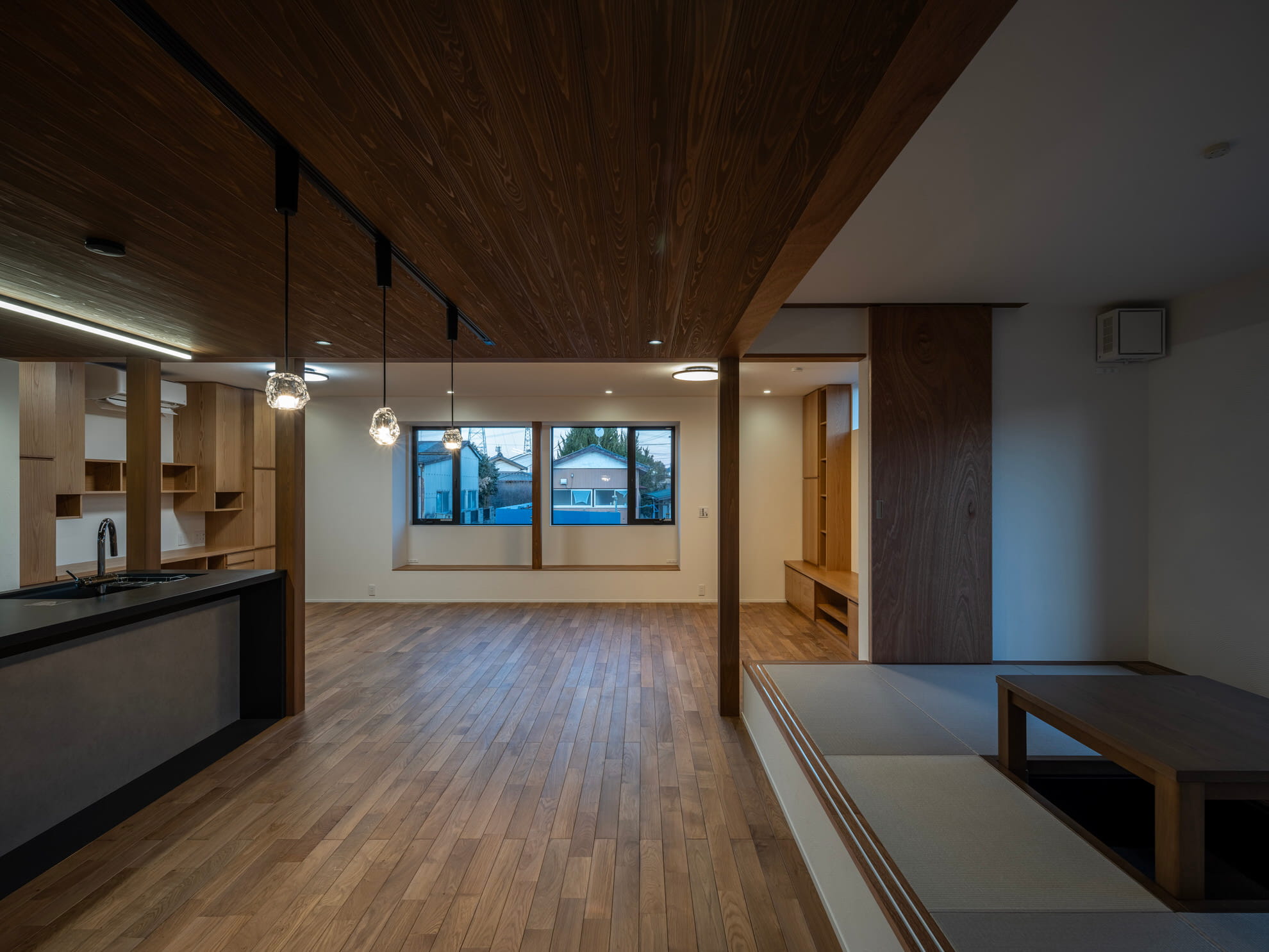 窓を背にした掘りごたつ付きの小上がり客間から、LDKをゆったりと見渡せる心地よさ