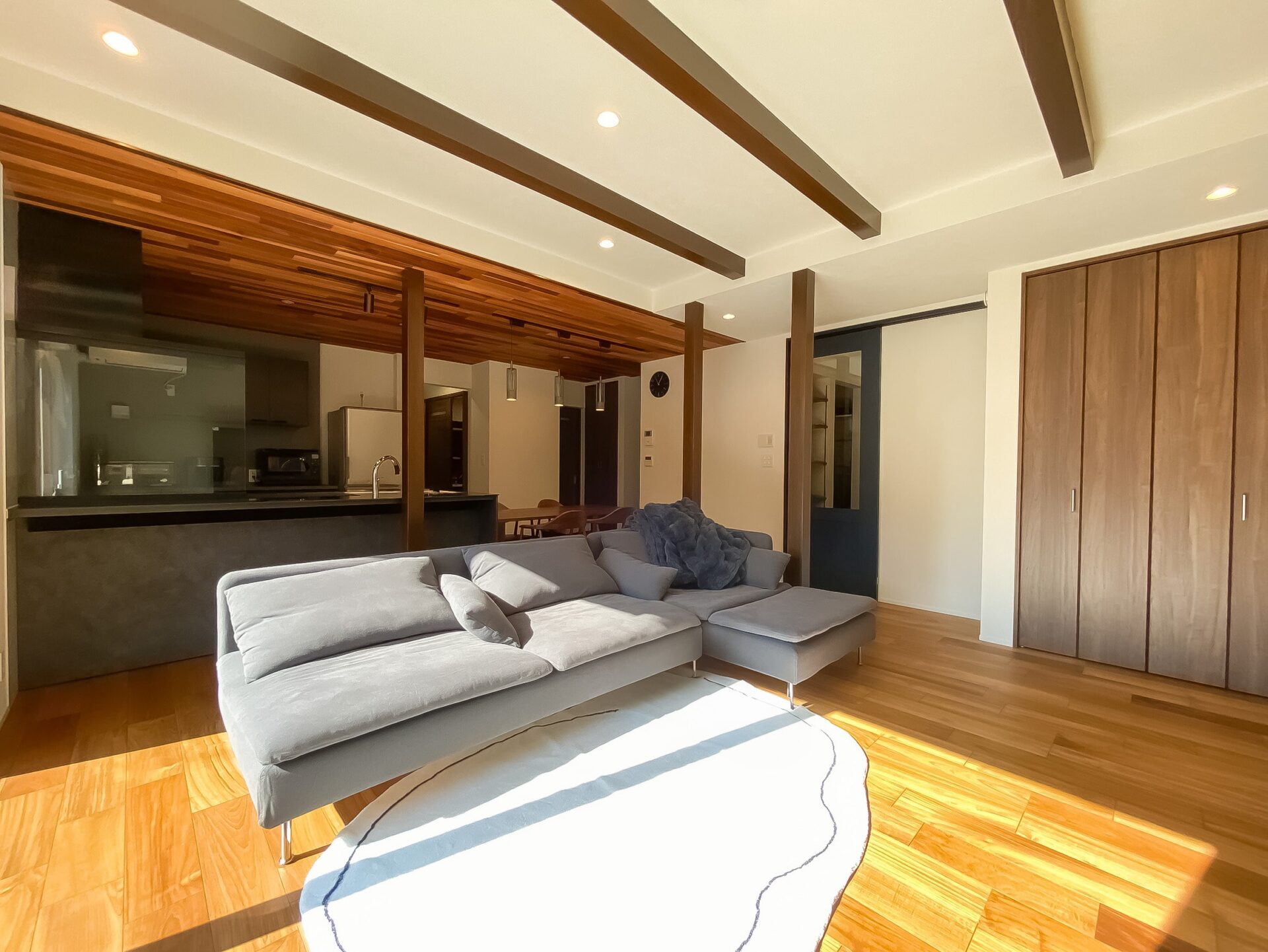 化粧梁×レッドシダー天井、ゾーニングで開放感LDK