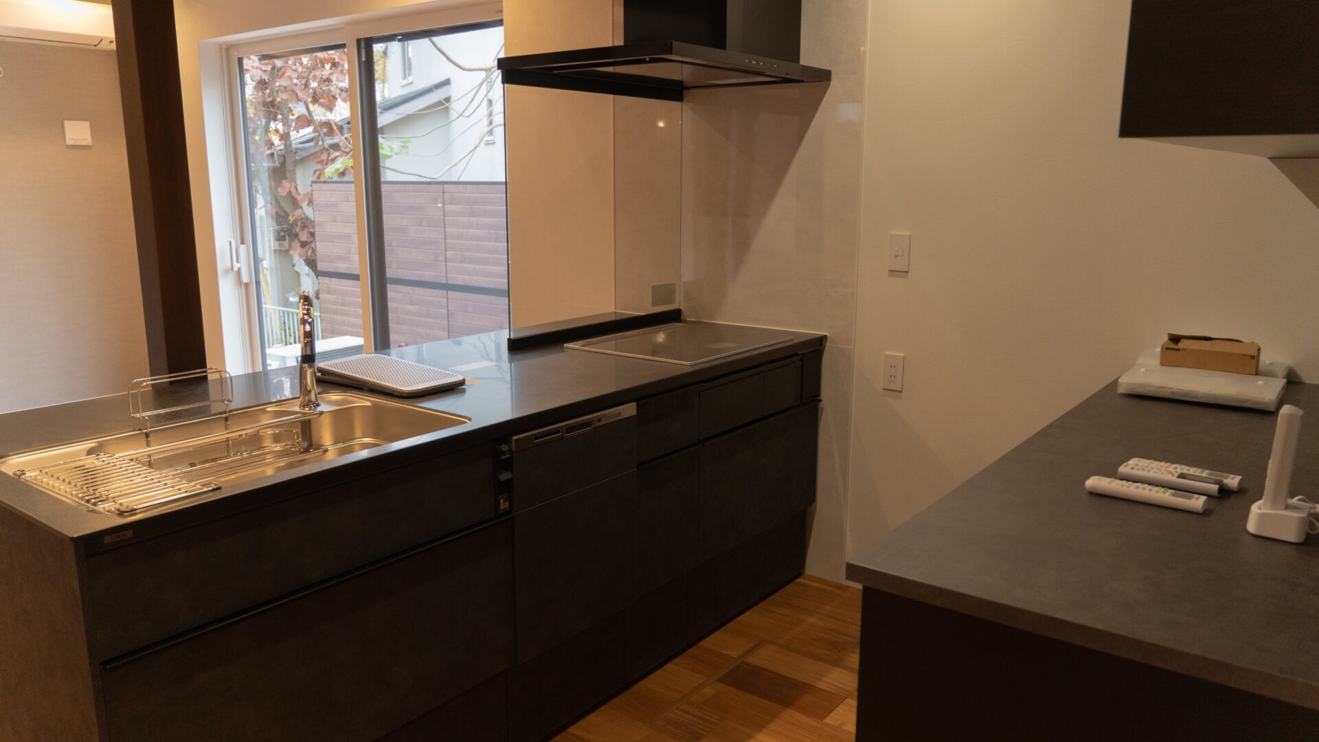 モダンなペニンシュラキッチン|リクシル (ブラックスタッコ)
