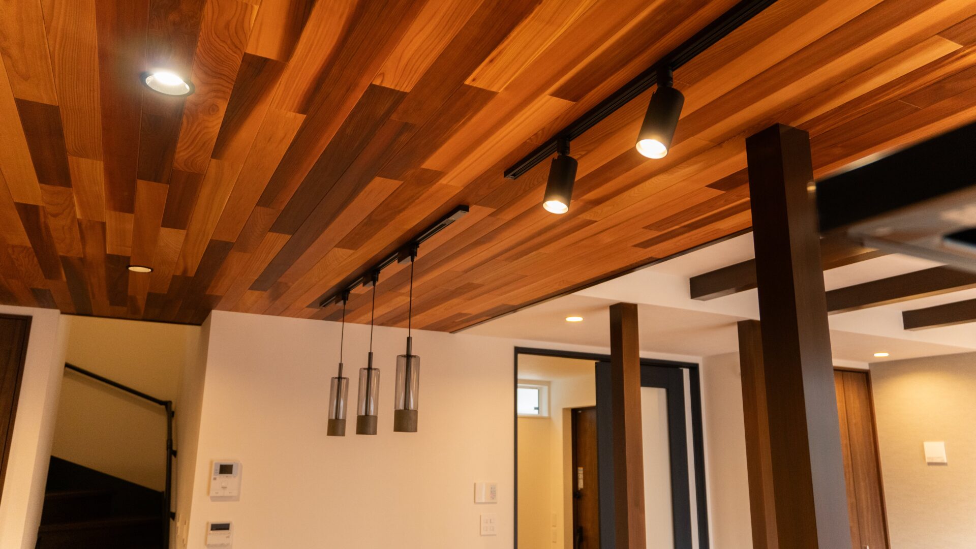 レッドシダーの天井にブラックダクトレール照明