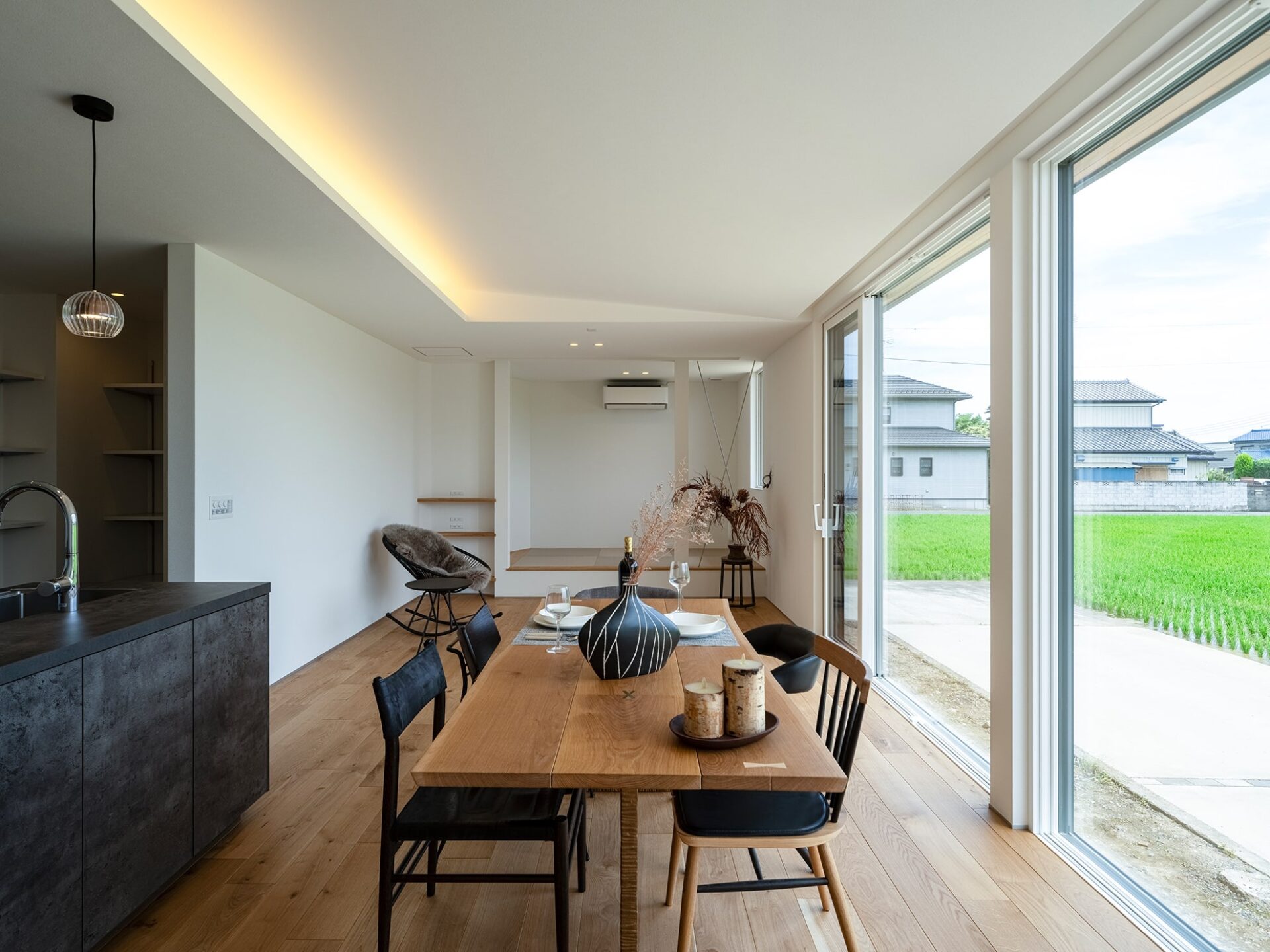 LDKの横には小上がりの和室を配置。家族全員が集まった時は小上がり和室やその前が子どもたちが遊ぶ場所、ダイニングテーブルでは大人たちがくつろぐ場所に。